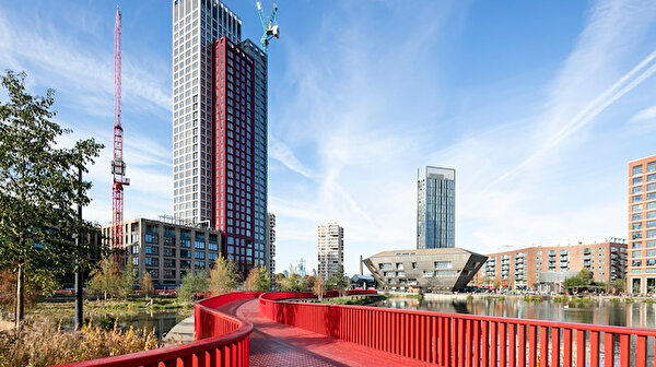 Asif Khan’ın tasarladığı yeni Canada Water köprüsü, Londra’nın gelişen şehir merkezi içinde doğayla bütünleşen bir yürüyüş yolu olarak hizmet veriyor. Canada Water master planının bir parçası olan 170 metre uzunluğundaki ahşap yürüyüş yolu, 19. ve 20. yüzyıllarda kereste ticaretinin merkezi olan Surrey Docks'un tarihinden ilham alıyor. Köprünün kırmızı rengi, Viktorya döneminde Kanada’dan getirilen kırmızı çam ağaçlarına bir gönderme olarak tasarlanıyor. Townshend Peyzaj Mimarlığı ekibi, su kenarına inen yeni basamaklar, oturma alanları ve eğitici bir gözlem havuzu tasarlayarak alanı, insanların bir araya gelip bölgenin mirası ve ekolojisi hakkında bilgi edinebileceği bir kamusal mekâna dönüştürüyor.