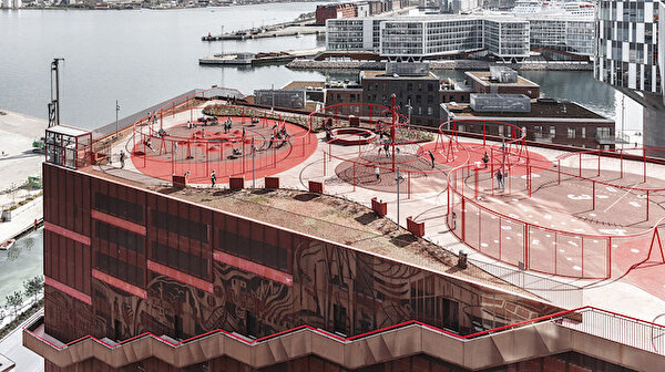 Jaja Architects tarafından tasarlanmış olan katlı otopark, Danimarka’nın Kopenhag şehrinde yer alıyor. Tasarım ofisinin Park ‘n’ Play ismini verdiği kamusal mekan projesi; hem otopark, hem çocuk oyun alanı, hem de Kopenhag Limanı’na bakan bir seyir noktası olma özelliği taşıyor.