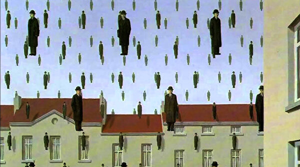 Gerçekliği değil, elbette temsil ettiği şeyi gördüğümüz bu tabloda, aslında gökten üzerimize adam yağmıyor, ulvi bir göğe yükseliş eyleminin resmedildiğini de söyleyemeyiz. Herkes ve her şey öylece donmuş, havada asılı kalmışlar sanki. Tek tip adamlar, yeryüzüne sığmamışlıklarıyla gökyüzünde duruyorlar, sıralı tertip halinde, kimse birbirine çarpmıyor mesela. Bireysellik var; ama robotlaşmışlık hâkim. Anlaşılmazlık var; ama düzensizlik yok. Aykırılık var; ama kuralsızlık yok. Bir tuhaflık var; ama nizamsızlık yok. Uzun siyah pardösü, beyaz gömlek, kravat ve fötr şapkalarıyla bürokrasiyi temsil etikleri muhtemel ifadesiz adamlar… Gölgeleri var ve evrakları... Bir de sıkıcı memurlukları…