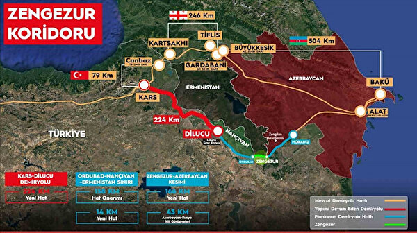 Cumhurbaşkanı Erdoğan, Zengezur Koridoru’nun kapısını açacak olan Kars-Iğdır-Aralık-Dilucu Demir Yolu hattının temellerinin atıldığını açıkladı. 224 kilometrelik hat tamamlandığında yıllık 5,5 milyon yolcu ve 15 milyon ton yük taşınacak, 2,4 milyar avroluk proje Çin’den İngiltere’ye uzanan ticaret hattını daha verimli hale getirecek.