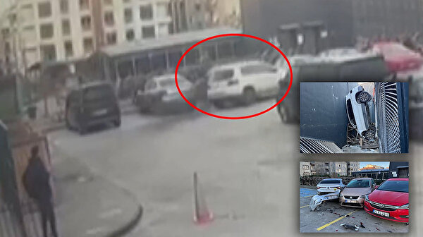 İstanbul Bahçelievler’de bir otopark çıkışında direksiyon hakimiyetini kaybeden kadın sürücü, 9 araca çarptıktan sonra demir korkulukları aşarak yaklaşık 5 metre yükseklikten boşluğa düştü. İtfaiye ekiplerinin müdahalesiyle sıkıştığı araçtan kurtarılan sürücü, ilk müdahalenin ardından hastaneye kaldırıldı. Olay anı ve kurtarma çalışmaları dron ile havadan görüntülendi.