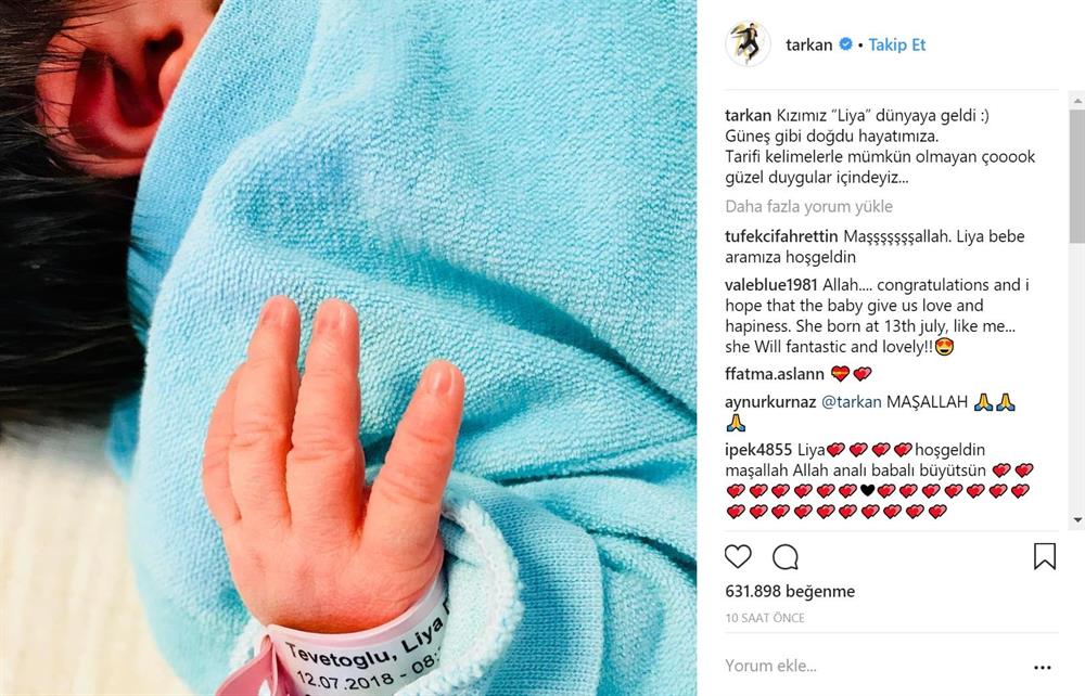 Megastar Tarkan, bebeğinin ilk fotoğrafını sosyal medya hesabından paylaştı. Kısa sürede 600 binin üzerinde beğeni alan fotoğrafa Tarkan, “Kızımız “Liya” dünyaya geldi :) Güneş gibi doğdu hayatımıza. Tarifi kelimelerle mümkün olmayan çok güzel duygular içindeyiz...” notunu düştü.