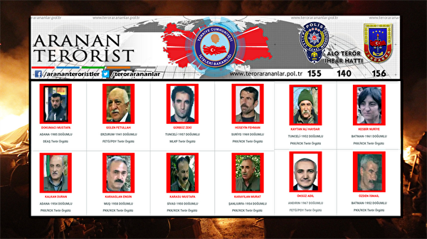 FETÖ lideri Fetullah Gülen, PKK liderleri Murat Karayılan ve Cemil Bayık, DHKP-C liderleri Musa Aşoğlu ve Zerrin Sarı gibi terörist başı ve örgütün üst düzey yöneticileri kırmızı listeyle aranıyor. (Ayrıntılı bilgi için)