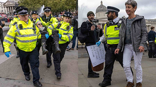 Dün Londra’daki Trafalgar Meydanı ve Westminster Köprüsü’nde bir araya gelen göstericiler, Filistin bayrakları dalgalandırarak, "Savaşı durdurun", "Yasağı kaldırın, suçlamaları kaldırın", "Barış" yazılı pankartlar taşımıştı. Londra polisi, protestoların başlamasından kısa bir süre sonra kalabalığa müdahale ederek göstericileri gözaltına almaya başlamış, gözaltına alınan kişiler direnmeden kalabalığın arasından geçirilirken, diğer göstericiler "Yazıklar olsun" sloganları atmıştı. Göstericiler ayrıca, Westminster Köprüsü’nde "Soykırıma karşıyım, Filistin Eylemi’ni destekliyorum" yazılı bir afiş açmıştı.