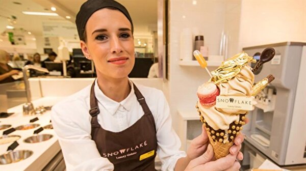 Snowflake Gelato'nun sahibi olduğu Selfridges mağazasında dondurmaya buluşmak için 15 dakika beklemek zorundasınız. Dondurmayı bu kadar pahalı olmasının nedeni, dondurmanın içerisinde bulunan 24 ayar altınlar ve yenilebilir elmaslarla süslenmiş olmasıdır.