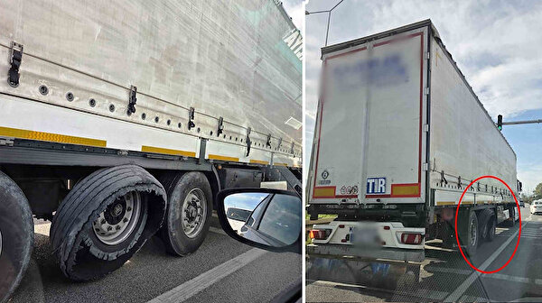 Arka tekerlerinden biri olmadan dakikalarca sürdü! Kazaya davetiye çıkaran tır yolculuğu