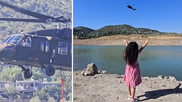 Hatay’da Türkiye-Suriye sınır hattında devam eden orman yangınına müdahale için barajdan su aldığı sırada skorsky pilotu kendini selamlayan kız çocuğunu fark ederek karşılık verdi. O anlar yürekleri ısıttı.