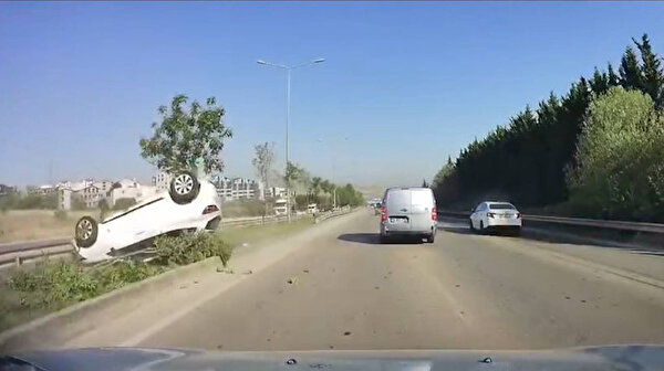 Bursa’da bir sürücü direksiyon hakimiyetini kaybedince, bariyerleri aşarak ters yöne girdi. Takla atan araçta bulunan sürücü ve eşi kazayı yara almadan atlatırken, o anlar araç içi kamerası tarafından kaydedildi.