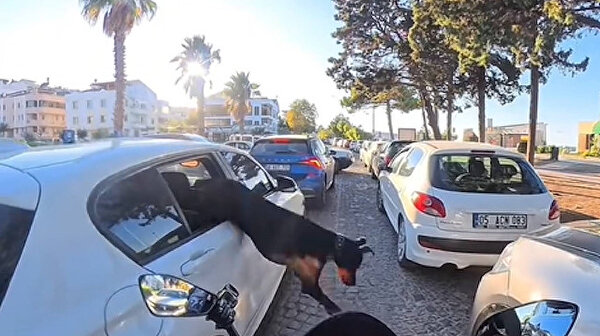 Trafikte ilerleyen motosikletli sürücü, enteresan bir kazayı kayda aldı. Önünde ilerleyen araçtan aniden bir köpek dışarı atladı. Bu sürpriz hamle üzerine köpeğin sahibi aracı terk ederek peşinden koşmaya başladı.