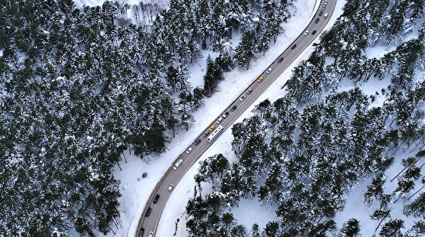 Zirve karla kaplanırken, dağ yolu da beyaza büründü. Drone ile havadan görüntülenen Uludağ yolundaki kar, seyrine doyumsuz bir manzara ortaya çıkardı. Beyaza bürünen çam ve köknar ağaçlarının görüntüsü kartpostalları aratmadı.