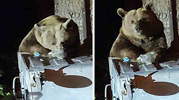 Turistik bölgede bir anda karşılarına ayı çıkan vatandaşlar, endişeli bakışlarla olan biteni izledi. Ayının çöp konteynerlerini tek tek devirerek yiyecek aradığı anlar cep telefonlarıyla saniye saniye kaydedildi.
