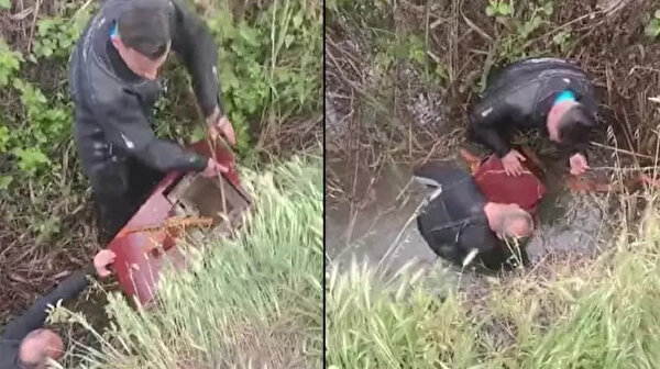 Çelik kasa atıldığı dere yatağında suyun içinden itfaiye erlerinin yardımıyla çıkartıldı.