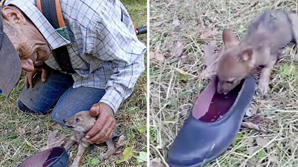 Yavru çakala ayakkabısıyla su içirdi: Çiftçinin şefkati duygulandırdı