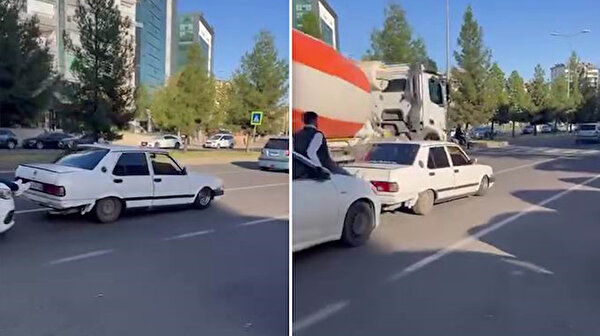 Diyarbakır’da bir kişi, yolda kalan Fiat Tofaş marka aracı, başka bir aracın kaputunun üzerine oturup ayakları ile ittirdi. Trafiğin tehlikeye atıldığı o anlar cep telefonu kamerasına yansıdı.