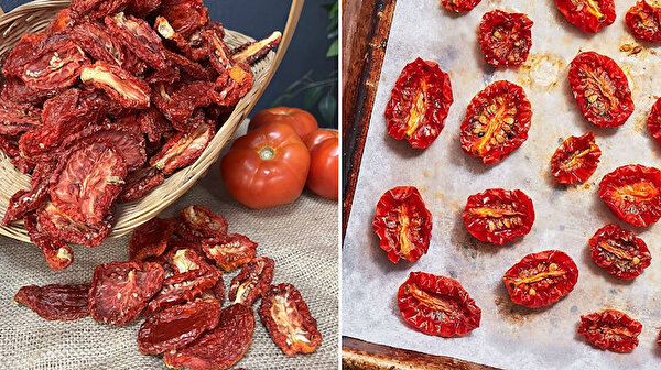 Eğer balkonlarınızda yeterince güneş yoksa, fırında da kurutmanız mümkün. Fırını 60-70 °C gibi düşük bir ısıya ayarlayın ve doğradığınız domatesleri yağlı kâğıt serili tepsiye yerleştirin. Fırın kapağı hafif aralık kalsın ki nem dışarı çıkabilsin. 6-10 saat arası, domatesler iyice suyunu çekip deri gibi olana kadar kurutun.