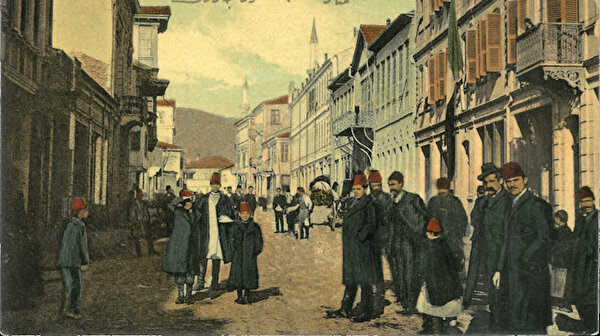Bu kartpostalda görülen minarelerden bir tanesi Yeni (Kadı Mahmut Efendi) Cami, diğeri İshakiye (İshak Paşa) Camii’dir. Cadde girişindeki Saat Kulesi ve yanındaki Düyun-u Umumiye binası, dönemin, en bilinen yapılarıdır. Cadde üzerinde 1890’larda Şark Oteli, belediye tiyatrosu, Katolik kilisesi ve kafeler inşa edilmiştir. Osmanlı döneminde, birçoğu bu cadde üzerinde, on iki konsolosluk açılmıştır.