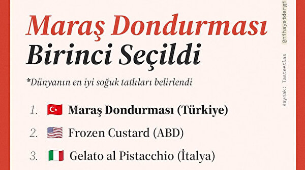 TasteAtlas tarafından hazırlanan “Dünyanın En İyi Soğuk Tatlıları” listesinde Türkiye’yi gururlandıran bir sonuç ortaya çıktı. Keçi sütü, doğal salep ve ustalıkla yapılan dövme tekniğiyle bilinen Maraş dondurması, listenin ilk sırasında yer aldı. Yoğun kıvamı, bıçakla kesilebilen yapısı ve uzayan dokusuyla öne çıkan bu tatlı, sadece bir lezzet değil, kültürel bir deneyim sunuyor.