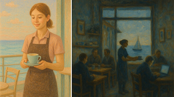 Sahilde, küçük bir kafede, dört masalı bir işletmede hem garson hem kasiyer hem de baristaydı bu güzel kadın. Orta boylu, ela gözlü ve kumraldı. Sabah 8’den gece 11’e dek dört masası hep dolu olurdu ama kapıda boş yer bekleyen müşteri de hiç bulunmazdı. Ne çok ne de az para kazanan bu kadın ve işletmesi, kimsenin dikkatini çekmezdi.