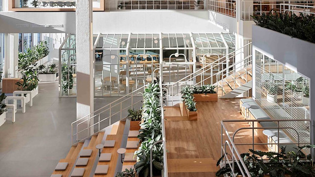 Giriş bölümünde, yuvarlak bankın bitişiğinde pazar yeri benzeri bir kafe ve çalışanların temiz havaya erişebilecekleri yarı açık bir teras alanı bulunuyor. Farklı seviyelerdeki görüş terasları ve ön girişe bakan pencereler öncelikle ziyaretçilere hizmet verirken, "arka ofis" çalışma alanları tasarımcı ve programcı ekiplere ayrılıyor.