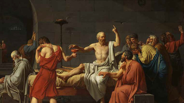 Sol eliyle göğü işaret ediyor adam, büyükçe bir yatağın üzerinde, beyazlar içinde. Tam bir aydır bu zindanda yatıyor, bir aydır öğrencileriyle birlikte geçirdiği mahkûmiyetinin sonuna gelmiştir artık. İdam cezasına çarptırılmış yaşlı bir filozof. Sürgüne gitme teklifini, zindandan kaçmayı, af dilemeyi ve dahi her şeyi reddederek, ölümün ona getireceklerine razı olmuş halde sükûnetle bekliyor. Onu ölümle korkutanlara varlığıyla cevap verirken, üzgün değil haklı, öfkeli değil, kararlıdır. Atina’ya hükmeden tanrılara inanmayı reddetmeye, gerçek bilgeliğin peşinde koşmaya, bildiğini dosdoğru söylemeye devam edecektir çünkü. Hakkındaki ferman, adil değildir. Hükümsüzdür bu yüzden.