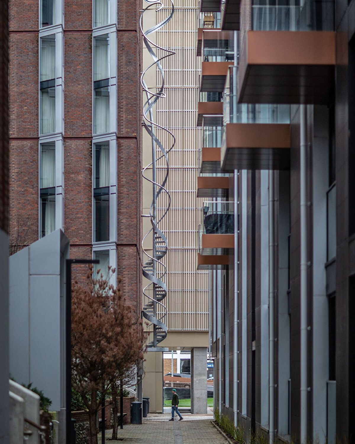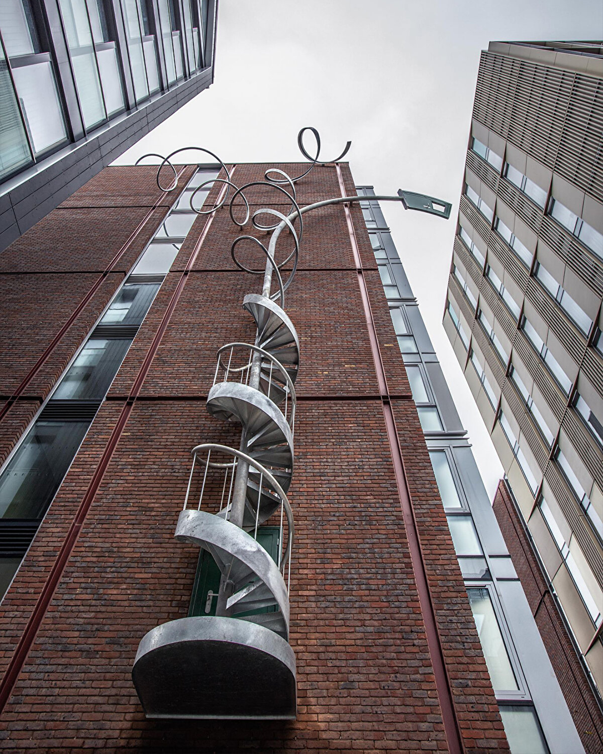 Sarmal bir merdiven şeklinde tasarlanan heykel, dinamik formuyla ön plana çıkarken yapının bulunduğu bölgenin monotonluğuyla da kontrast oluşturuyor.