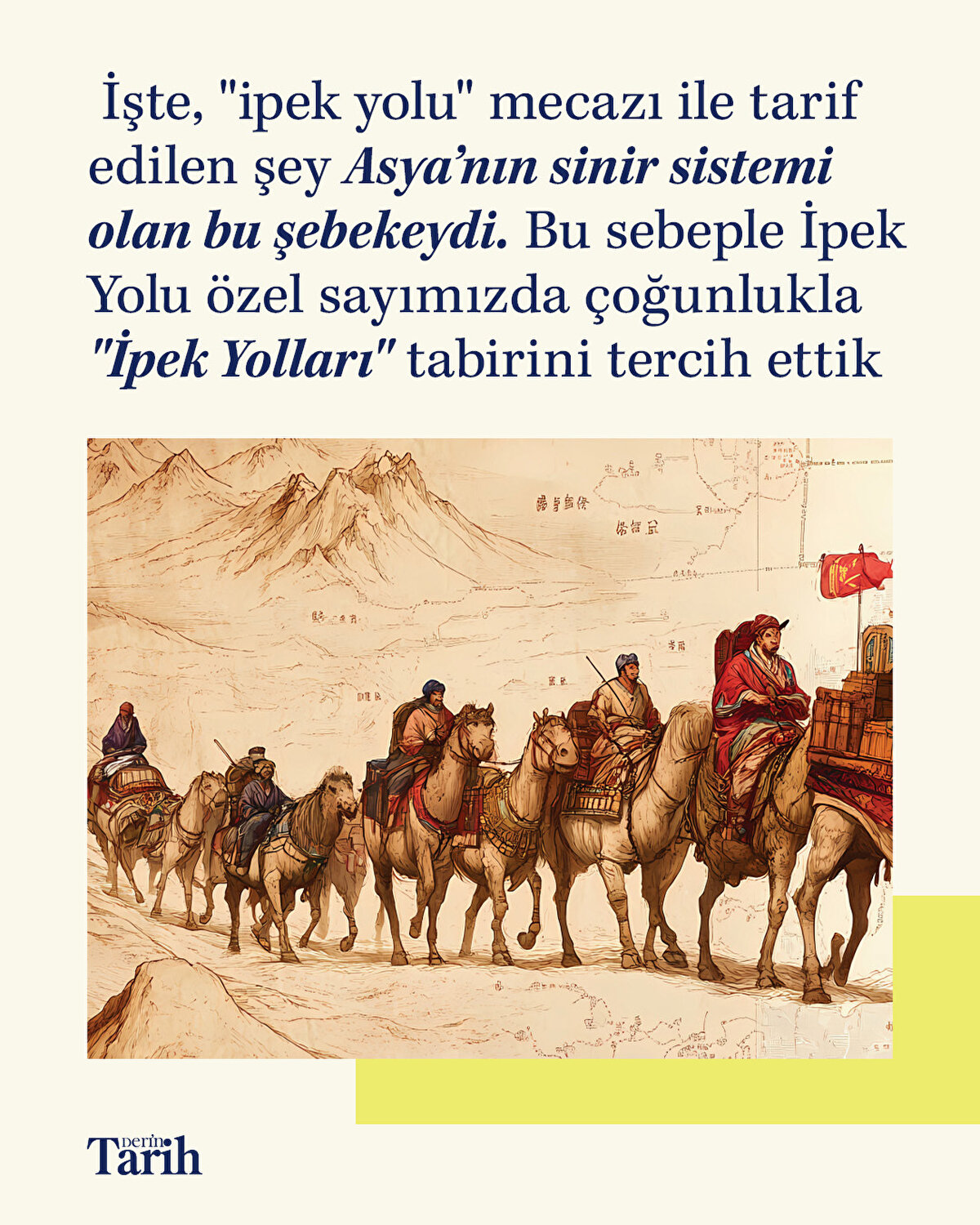 Alman coğrafyacı Ferdinand Freiherr von Richthofen'in 1877'de "İpek Yolu" (Seidenstrasse) tabirini bulması delinin kuyuya bir taş atması gibidir. Voltaire, Kutsal Roma İmparatorluğu'nu alaya almak için "ne kutsal ne Roma" demiş. İpek Yolu da öyle. Ne ipek ne de yol! Çin'den batıya doğru akan tek yönlü bir trafik yoktu, zaten tek bir yol da yoktu. Yerel tüccarların kullandığı pek çok deniz/kara güzergâhından oluşan bir Afro-Avrasya yol şebekesi çok sayıda kenti birbirine bağlamaktaydı. İşte, "ipek yolu" mecazı ile tarif edilen şey Asya'nın sinir sistemi olan bu şebekeydi. Bu sebeple İpek Yolu özel sayımızda çoğunlukla "İpek Yolları" tabirini tercih ettik.
