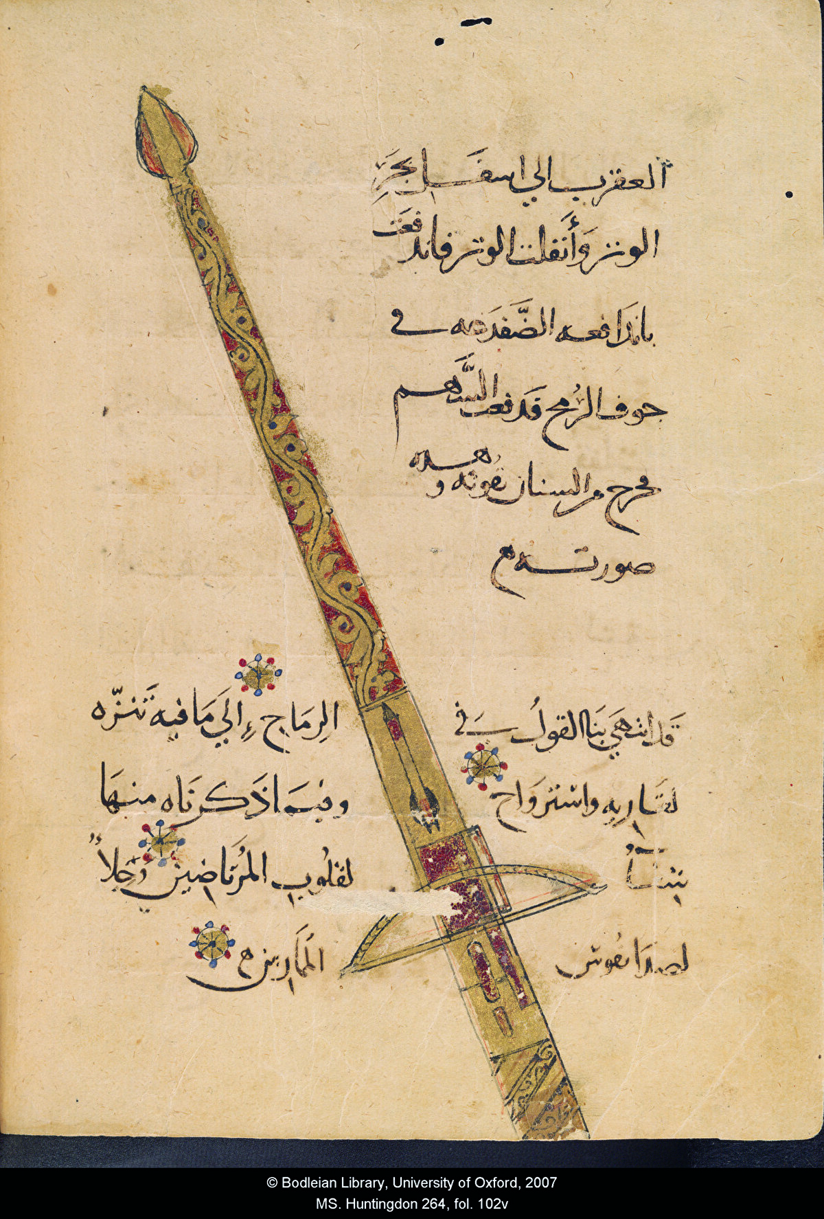 Silah çeşitleri ve zırhlar üzerine Selahaddin'e ithafen kaleme alınmış bir risalede bileşik kalkan-yay ve mızrak-yay çizimleri görülüyor.