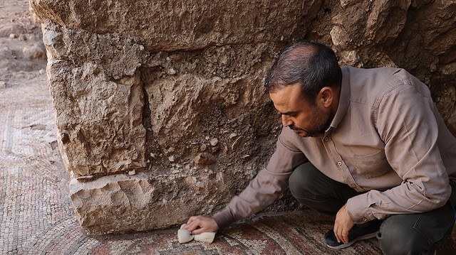 "40 metrekareye yakın bir mozaik ortaya çıkardık. Ana panolarda düğüm motifi şeklinde madalyonlar bulunmakta, bu madalyonların içerisinde de geometrik şekiller ile haç işareti olarak nitelendirebileceğimiz motifler tespit edilmiştir."