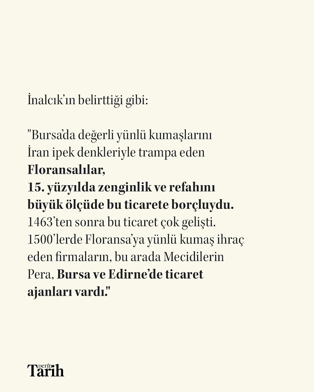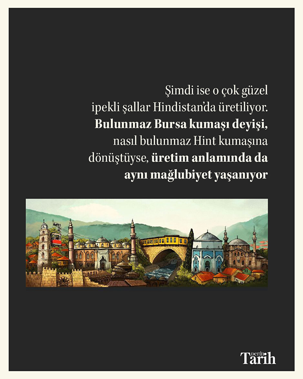 Bugünün Milano modası, geçmişte Bursa'nın ürettiği ipekli kumaşlarda yaşıyordu. "Bursa'da değerli yünlü kumaşlarını İran ipek denkleriyle trampa eden Floransalılar, 15. yüzyılda zenginlik ve refahını büyük ölçüde bu ticarete borçluydu . 1463'ten sonra bu ticaret çok gelişti. 1500'lerde Floransa'ya yünlü kumaş ihraç eden firmaların, bu arada Mecidilerin Pera, Bursa ve Edirne'de ticaret ajanları vardı." Şimdi ise o çok güzel ipekli şallar Hindistan'da üretiliyor. Bulunmaz Bursa kumaşı deyişi, nasıl bulunmaz Hint kumaşına dönüştüyse, üretim anlamında da aynı mağlubiyet yaşanıyor . Derin Tarih'in İpek Yolu özel sayısında...