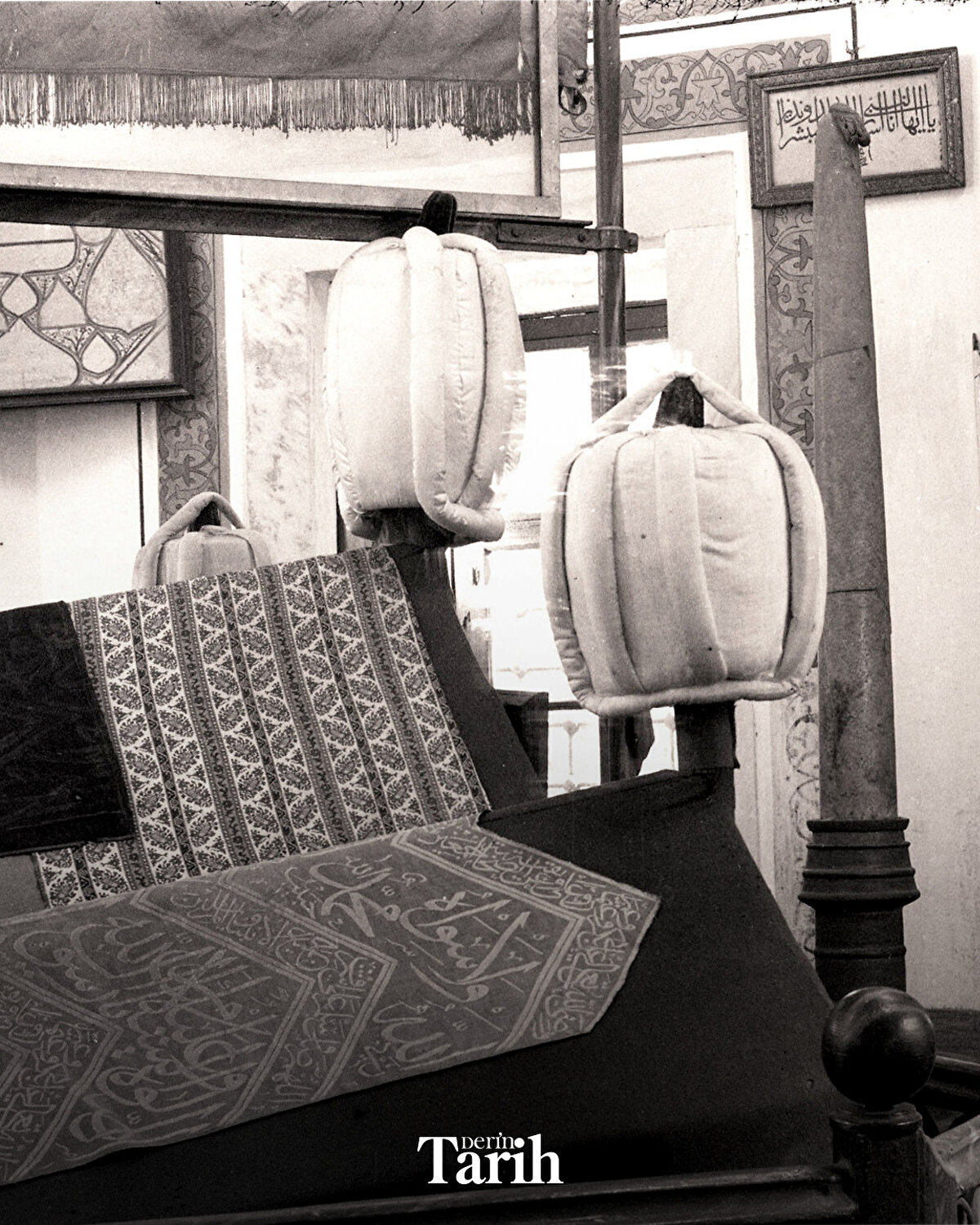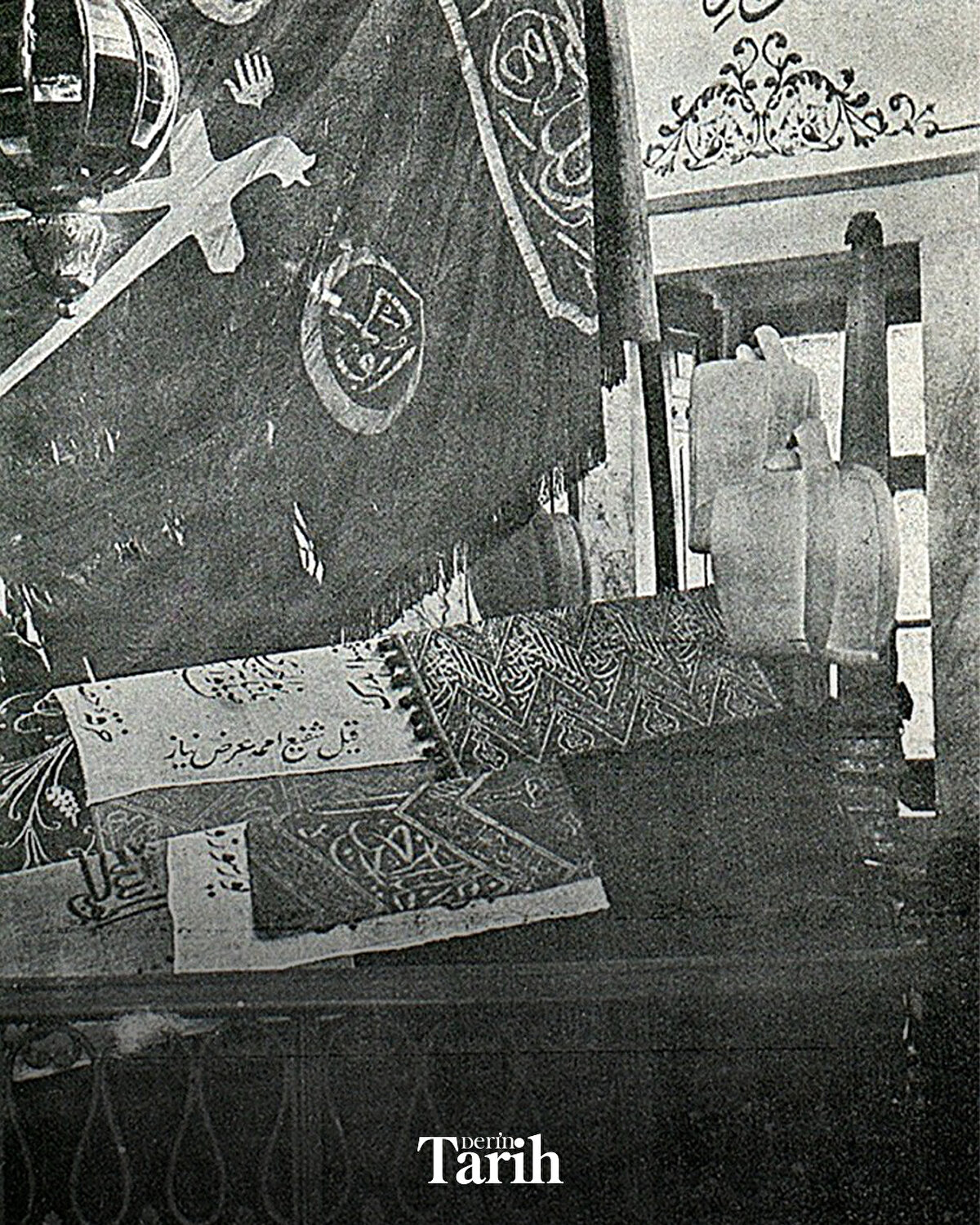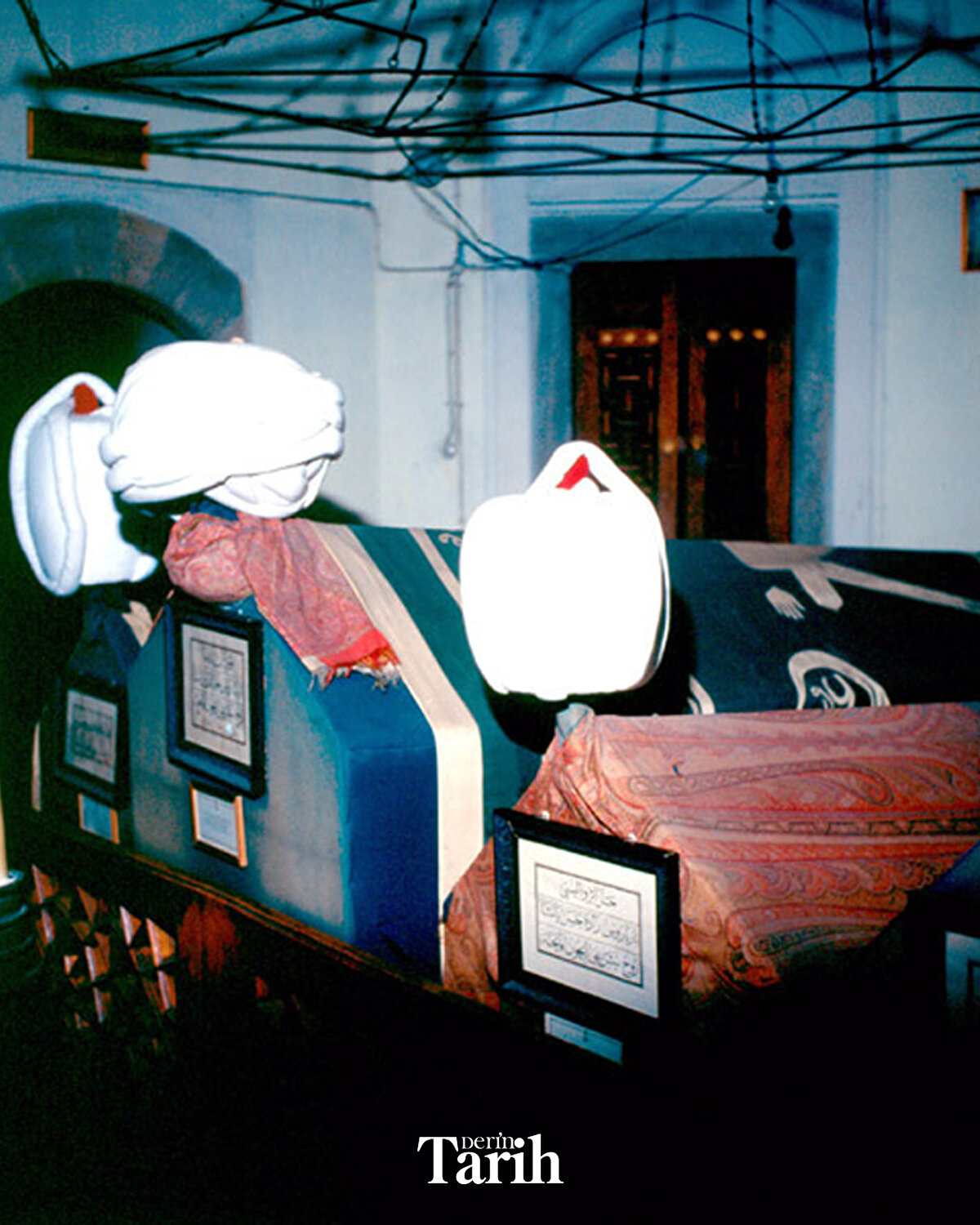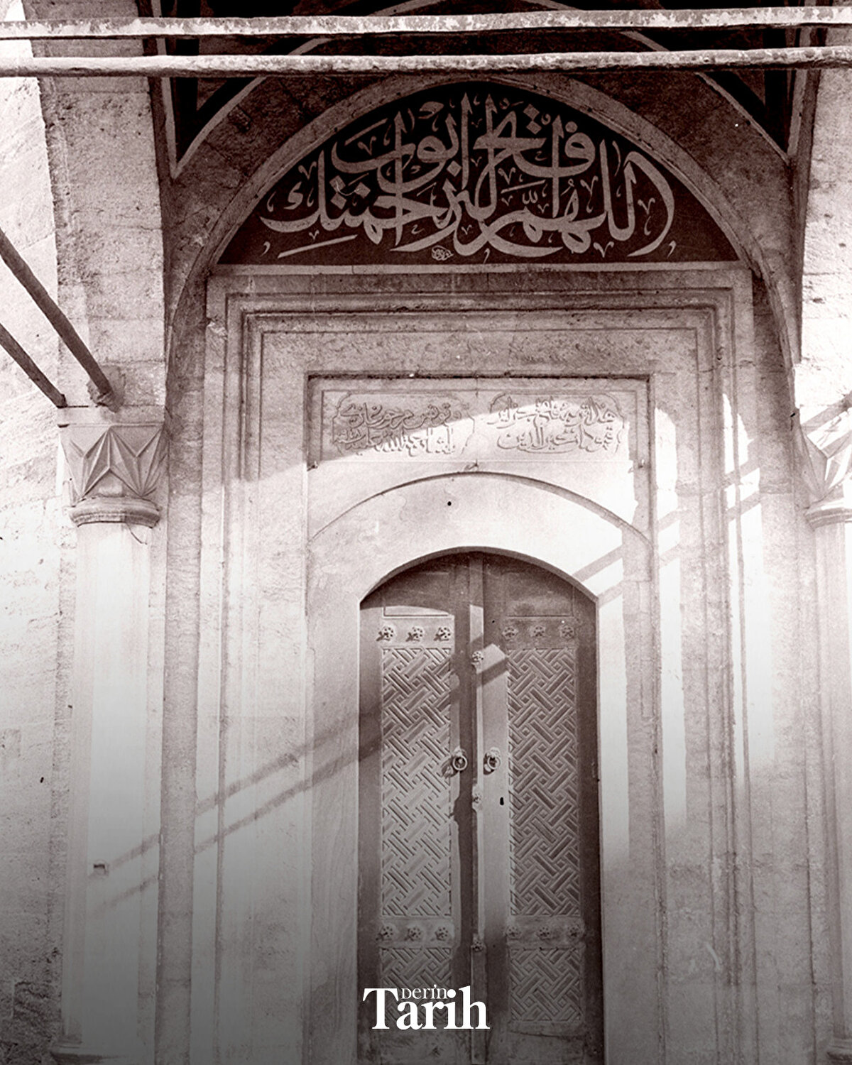 ▪Kitâbe üstündeki kemerin arasında ise celî sülüsle “Allahümme'ftah lehû ebvâbe rahmetike" (Yâ Rab, ona rahmet kapılarını aç) ibaresi vardır.