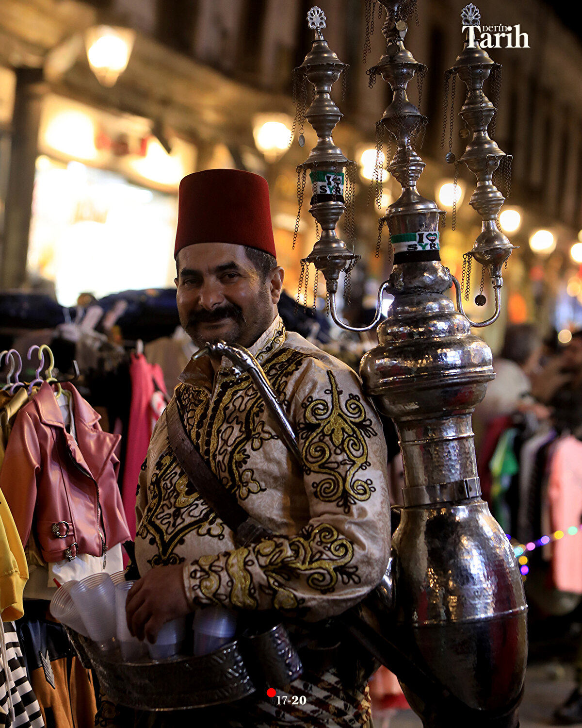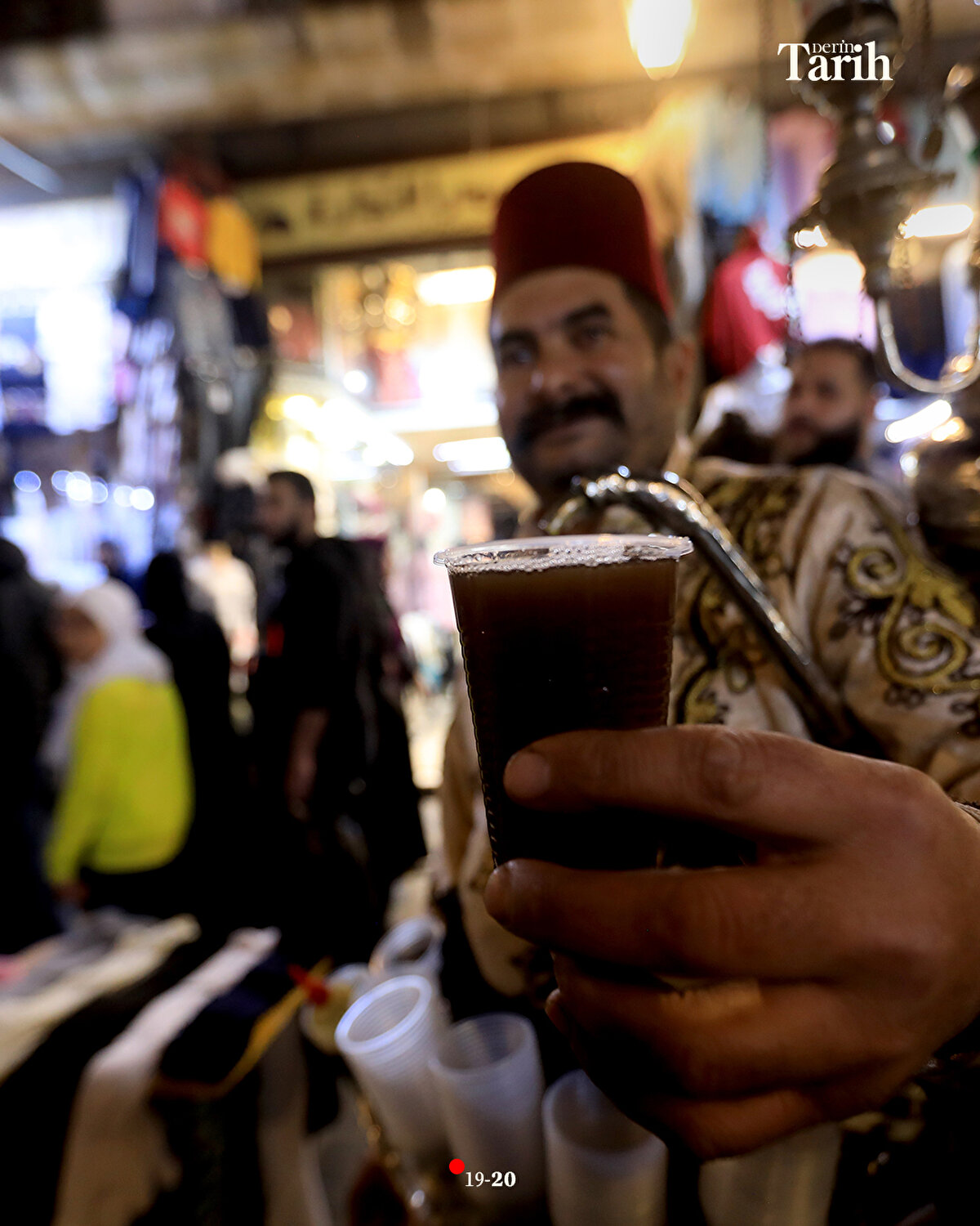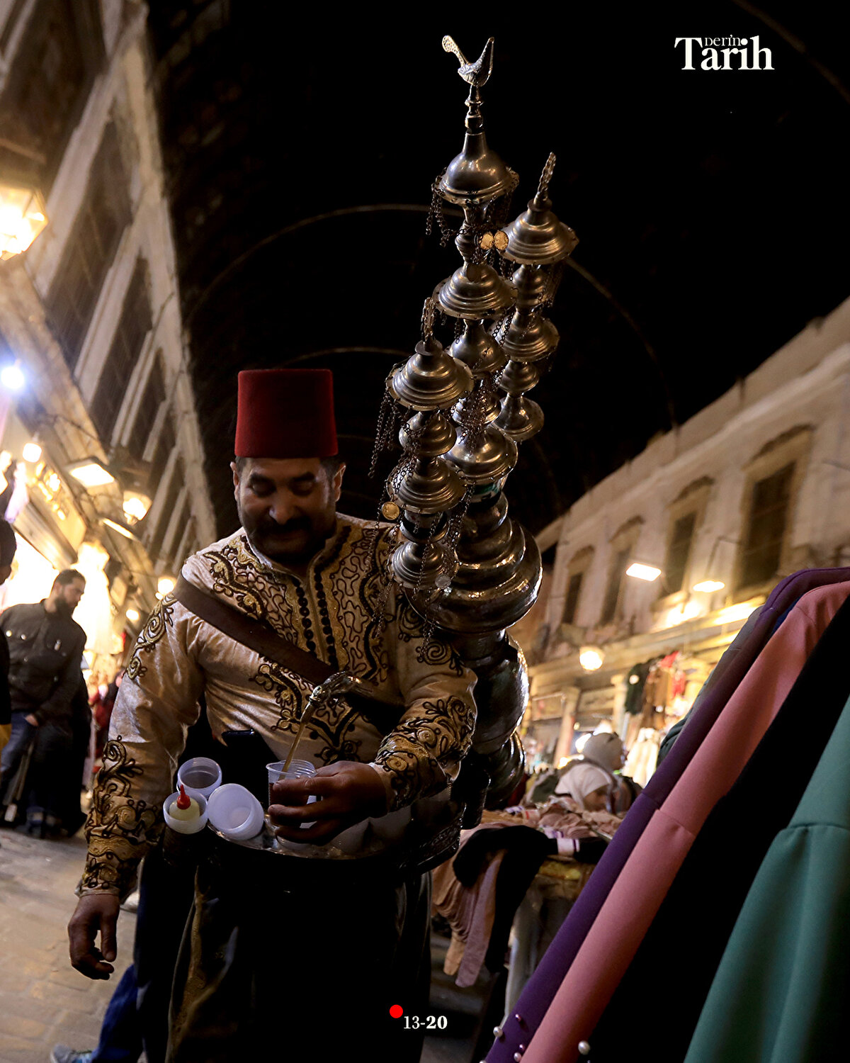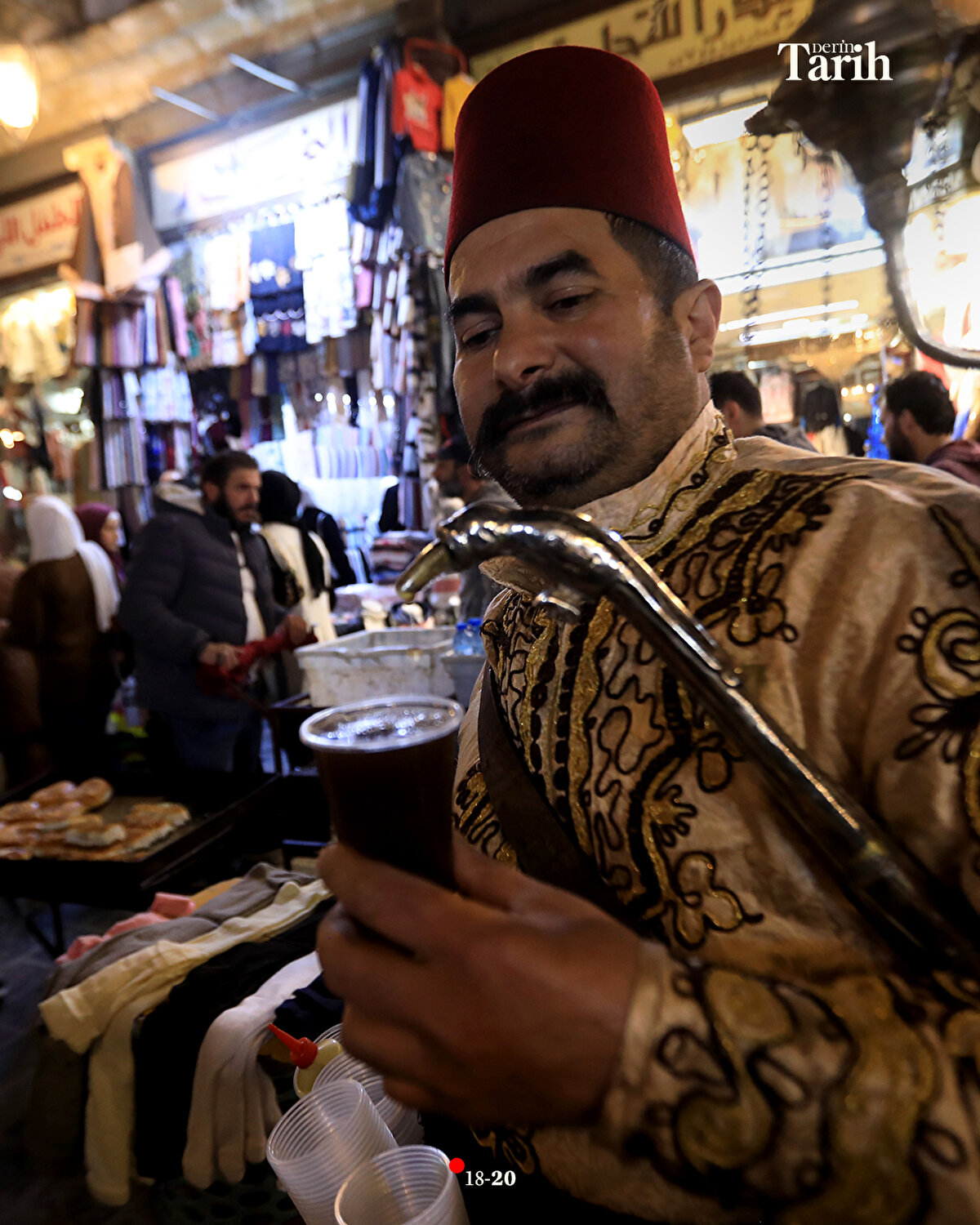 Evinde hazırladığı şerbetlerin bir kısmını, iftar öncesi tezgahında satan ya da dükkanlara dağıtan Ebu Muhammed, iftar sonrasında da başındaki fesi, geleneksel kıyafeti ve sırtındaki 16 litrelik tulumbasıyla Hamidiye Çarşısı'nın yolunu tutuyor.