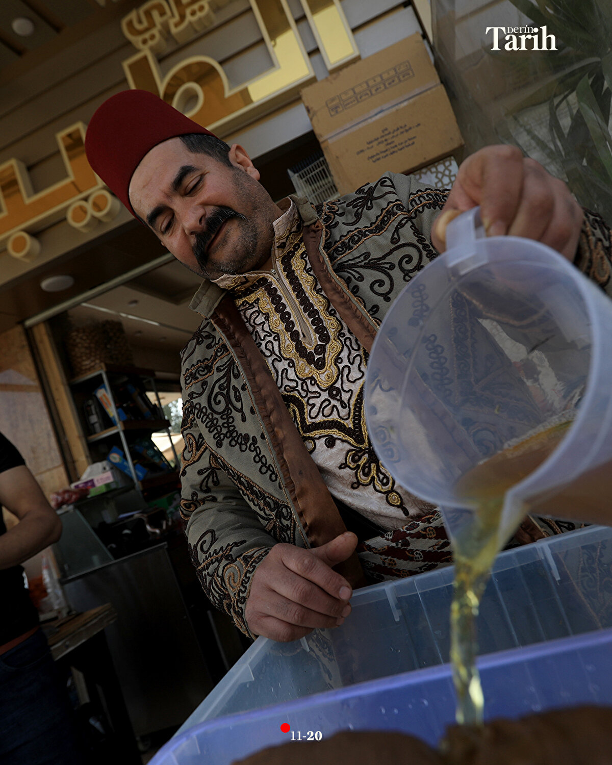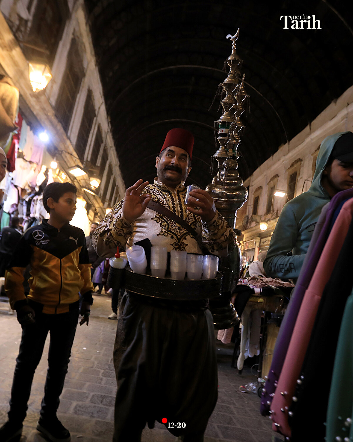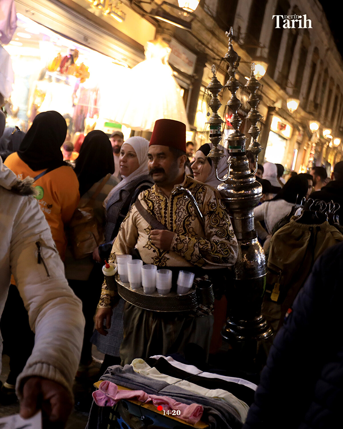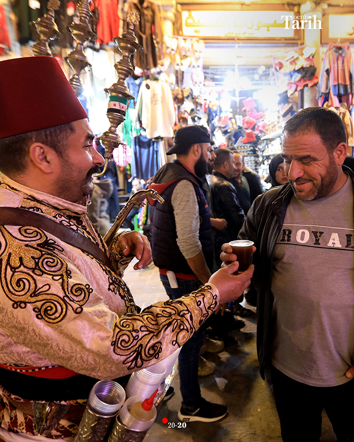 Evinde hazırladığı şerbetlerin bir kısmını, iftar öncesi tezgahında satan ya da dükkanlara dağıtan Ebu Muhammed, iftar sonrasında da başındaki fesi, geleneksel kıyafeti ve sırtındaki 16 litrelik tulumbasıyla Hamidiye Çarşısı'nın yolunu tutuyor.
