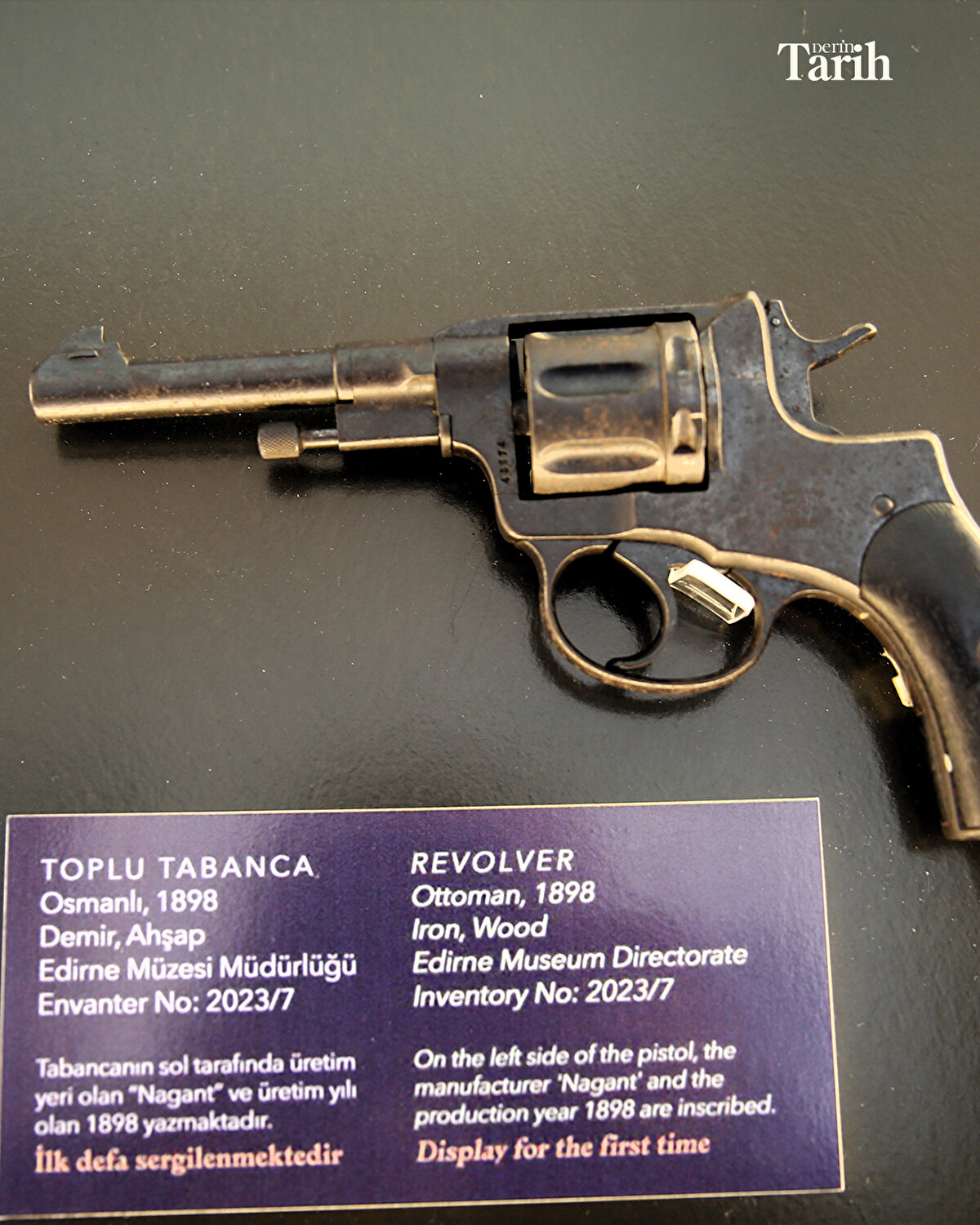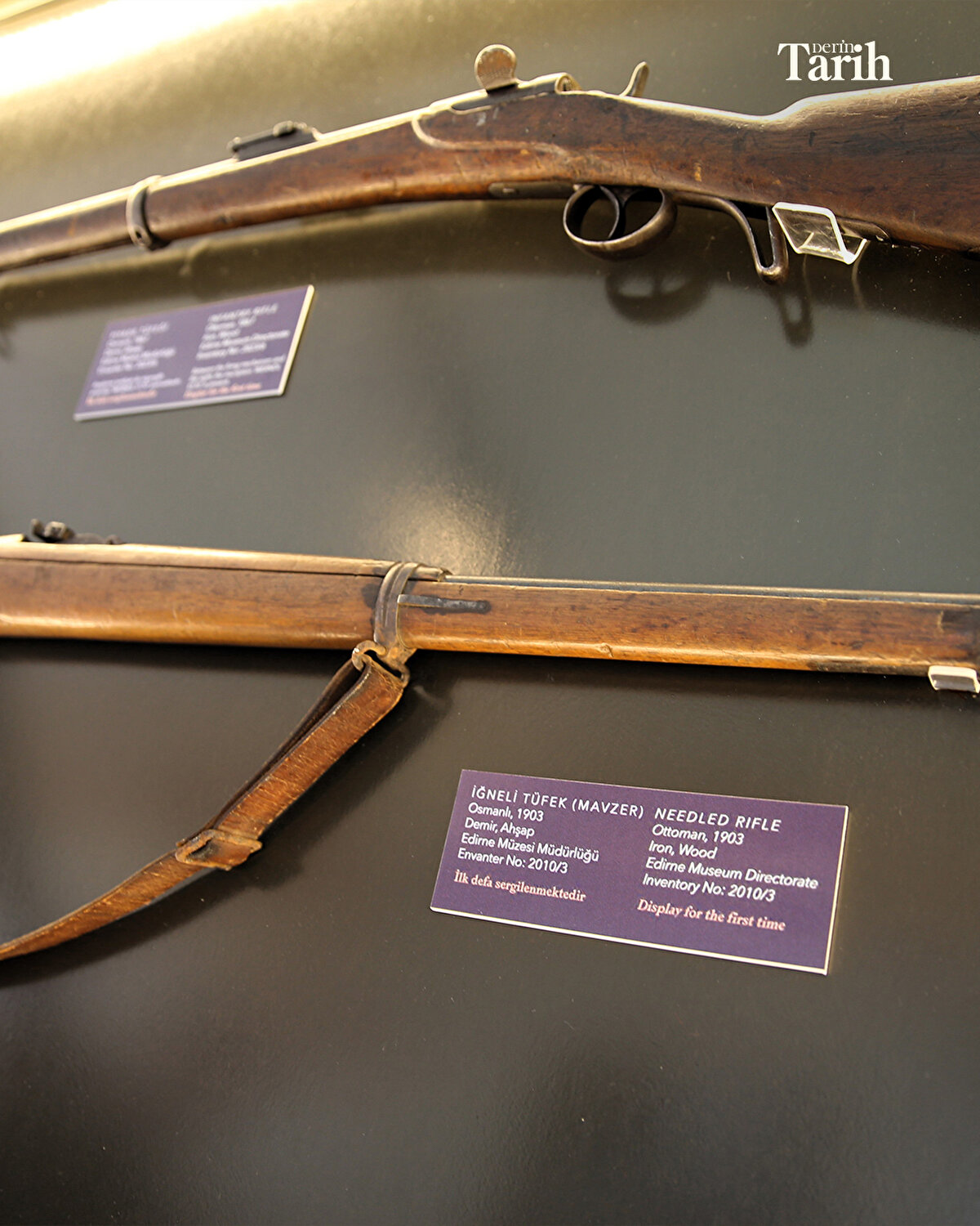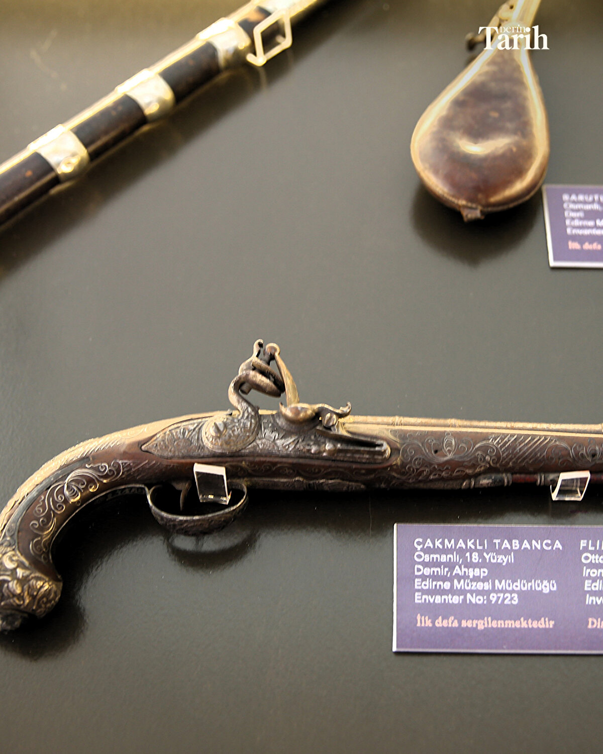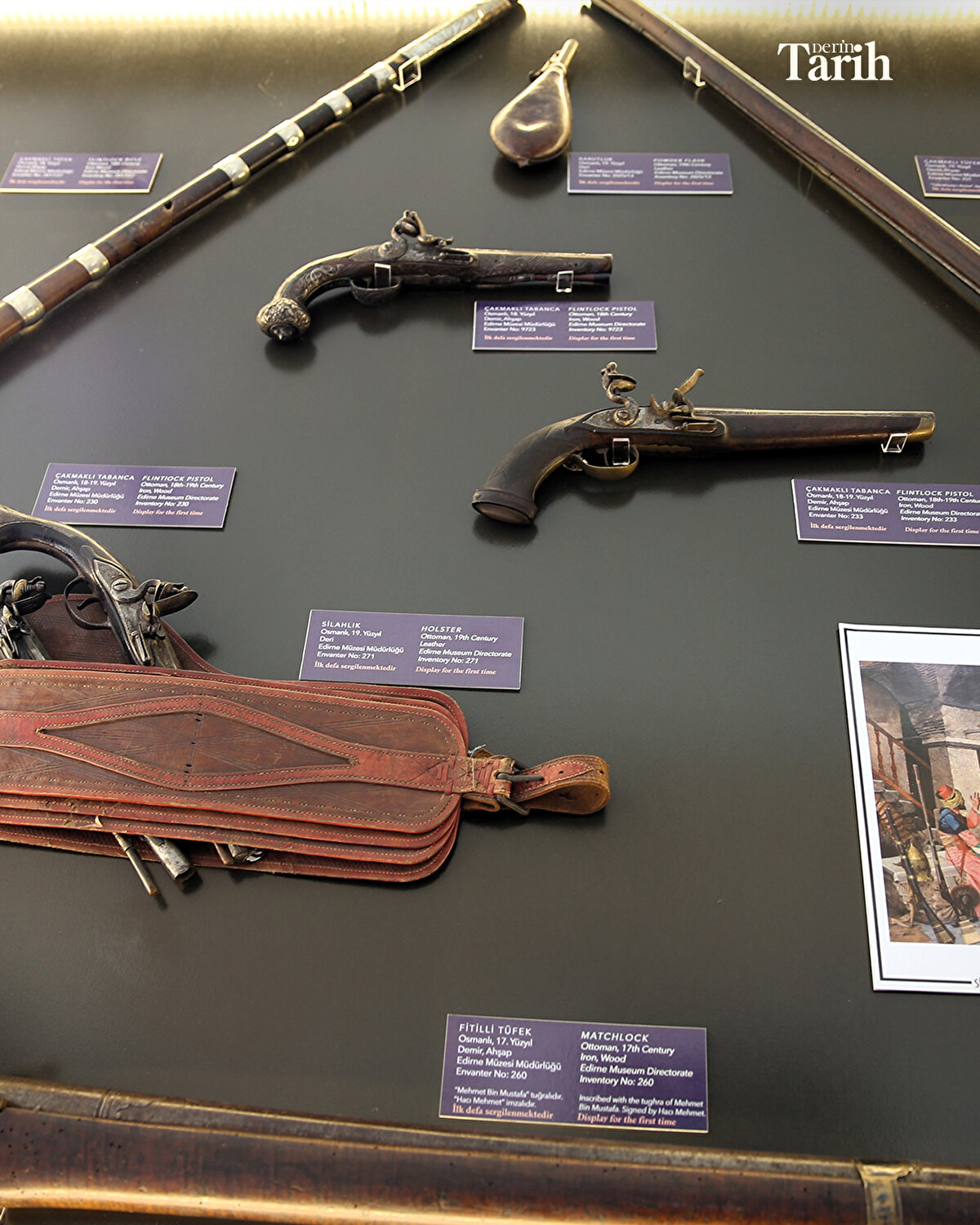 Edirne Müzesi Müdürlüğünün ateşli ve ateşsiz silahlar koleksiyonunda bulunan farklı dönemlere ait sapan taşları, el baltaları, ok uçları, teberler, kılıçlar, tabanca ve silahlardan oluşan sergi, ziyaretçileri zamanda yolculuğa çıkarıyor.