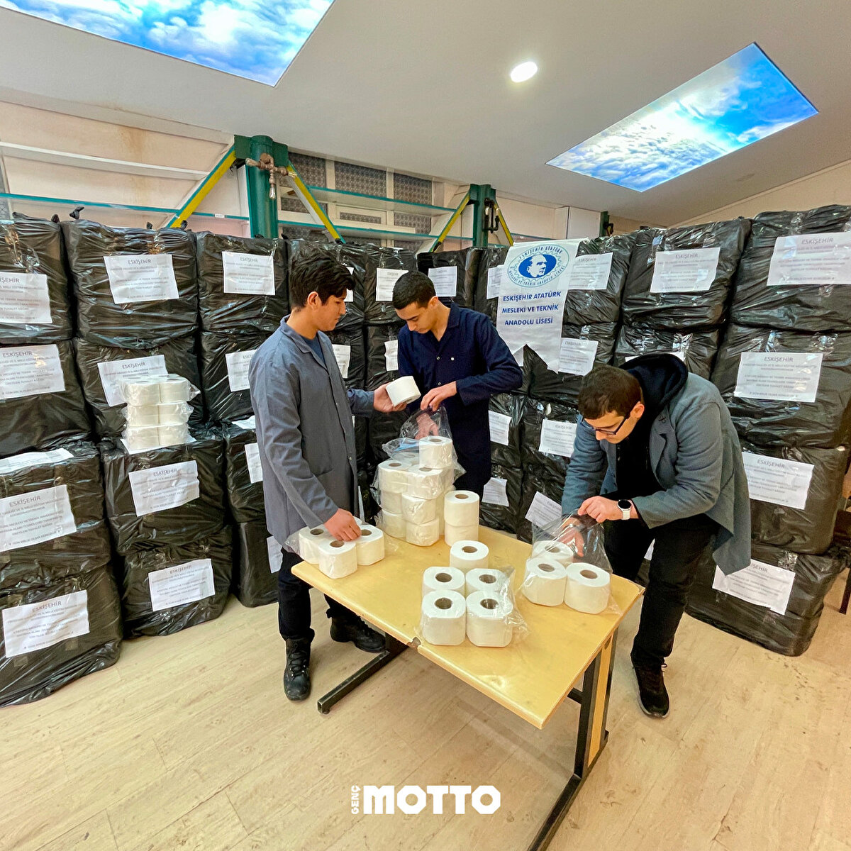 Eskişehir Atatürk Mesleki ve Teknik Anadolu Lisesi öğrencileri ve öğretmenleri, atölyelerinde depremzedeler için 3 günde 1 ton tuvalet kağıdı ürettiler, 'Gün birlik olma günüdür' etiketleri ile deprem bölgelerine gönderdiler.