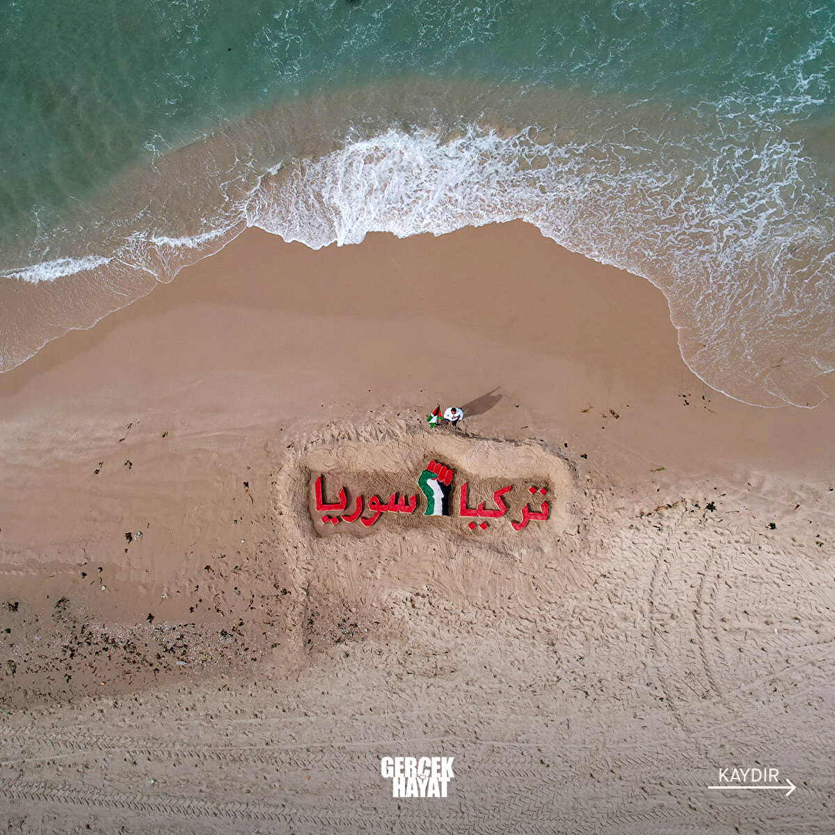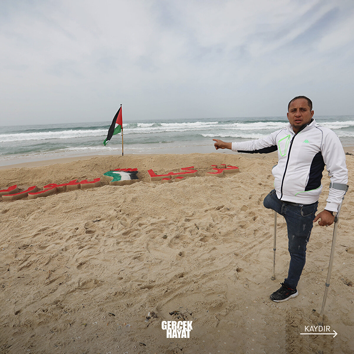 Yürüme engelli Filistinli ressam Muhammed Tutah, Gazze sahilinde kumların üzerine Türkiye ve Suriye yazarak desteğini gösterdi.
