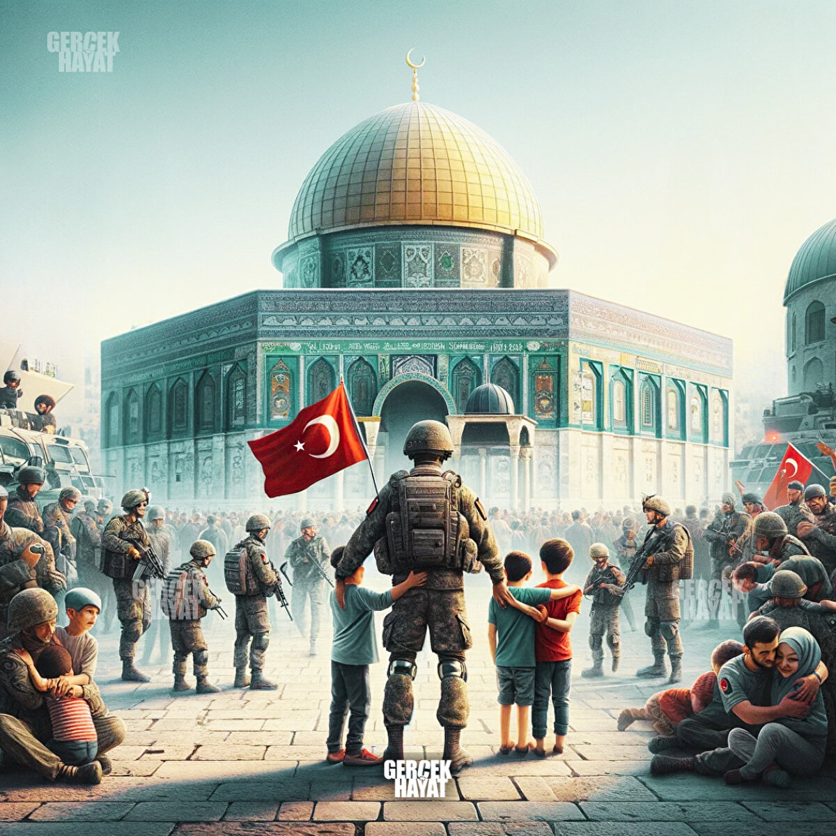 Kudüs'ü fetheden Türk askerlerini Mescid-i Aksa'da gören çocuklar askerlere sarılıyor