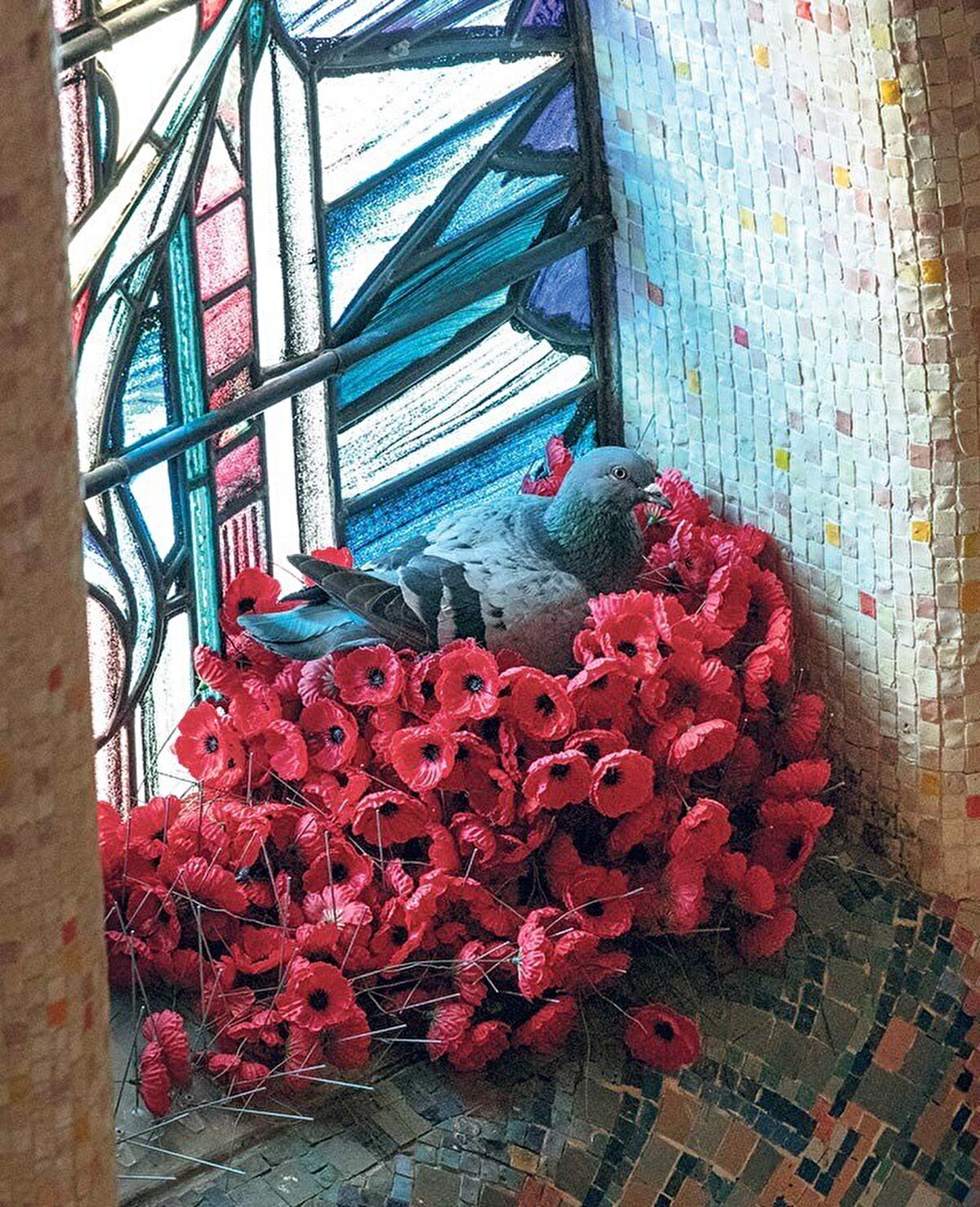 Avustralya'da bir savaş müzesini ev olarak seçen dişi güvercin, ziyaretçiler tarafından bırakılan yapma gelinciklerden kendine yuva yapmış.