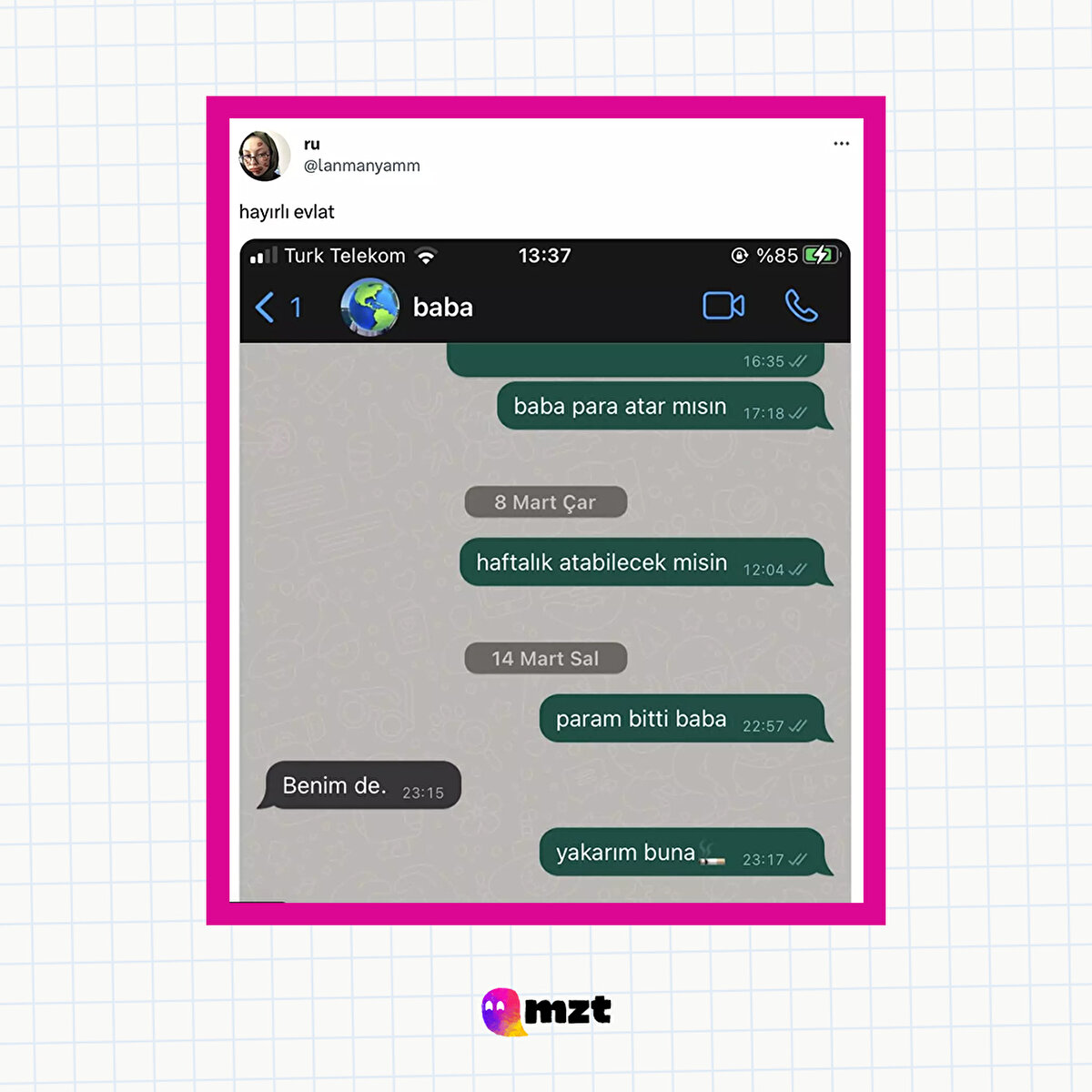 Özellikle ailelerimiz, annelerimiz, babalarımız ile telefonda veya mesajlaşarak gerçekleştirdiğimiz konuşmalarda kendimizi bazı beklenmedik veya tuhaf diyaloglar içerisinde bulunmamız bizler için oldukça kaçınılmaz bir durumdur. İşte tam da böyle zamanlarda gerçekleştirdiğimiz bu konuşmaları sizler için tek bir gönderide derledik. Peki sizin favoriniz hangi konuşma oldu?