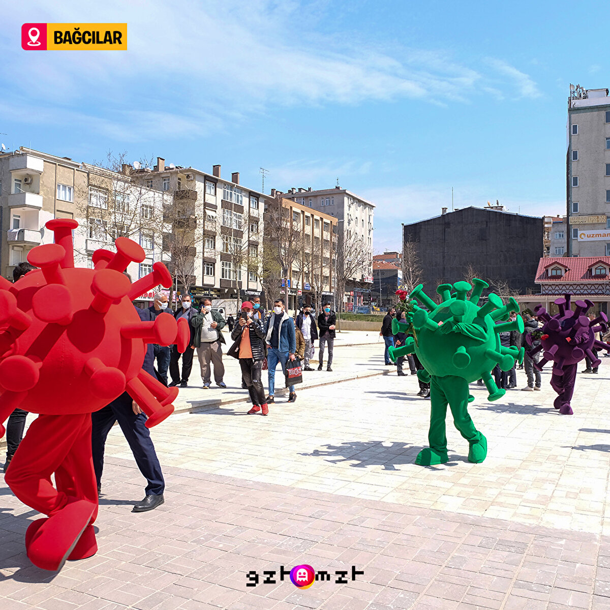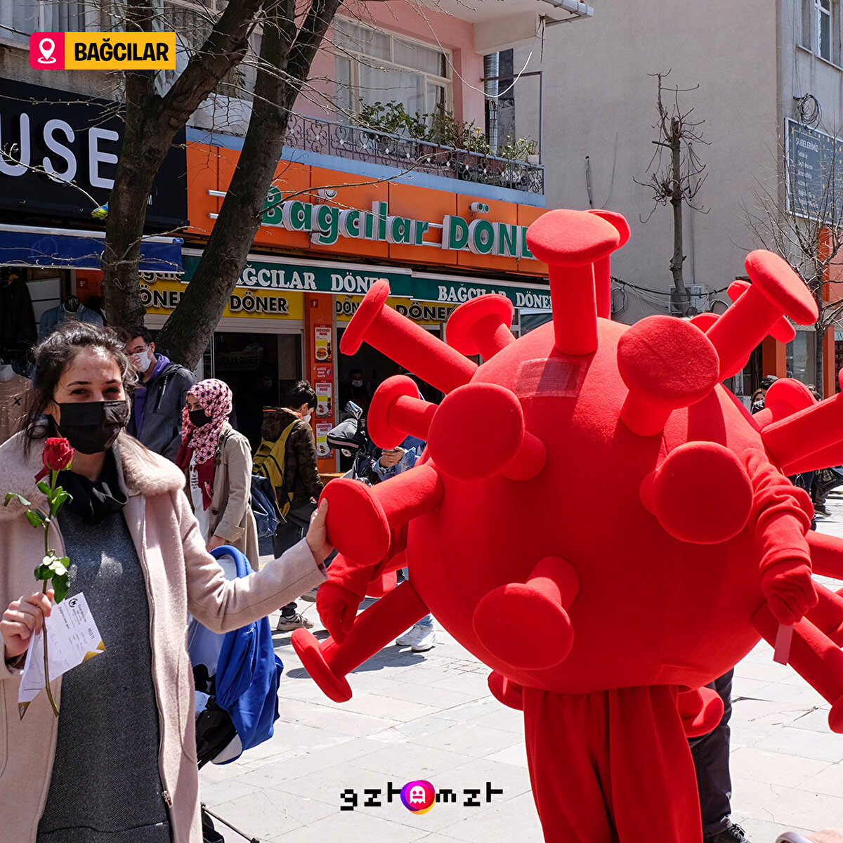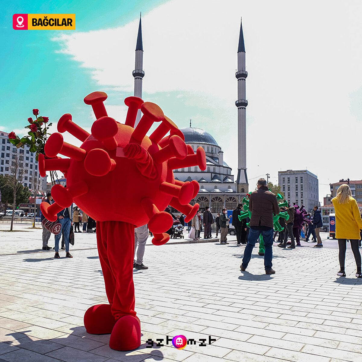 Bağcılar Belediyesi çalışanları virüs kostümü giyip, insanlara gül dağıttı