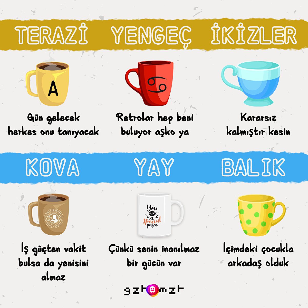Burçların bütün özelliklerine inanmasak da ortamlarda bilmiyorum dememek için bir iki yorum öğreniyoruz. Yengeçlerin duygusal, koçların inatçı olduğunu biliyoruz örneğin. Milli içeceği çay kahve olan insanlar olarak, hangi kupayı hangi burçtaki insanın tercih edeceğini de bu kadar bilgiyle tahmin etmiş olduk. Sizin kupanız hangisi?