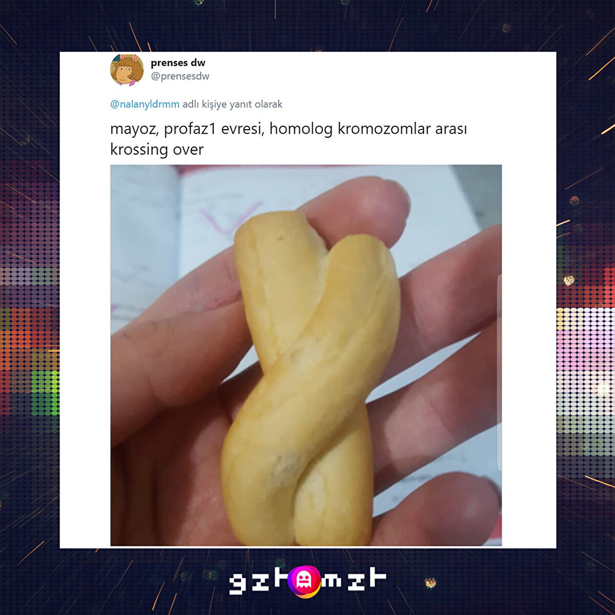Twitter alemi yine bildiğimiz gibi... Bir kullanıcının ekmeği RNA ve DNA'ya benzetmesi üzerine, diğer kullanıcılar da yıllardır bu günü bekliyormuşçasına evdeki hamur işleriyle sosyal medyada biyoloji dersi vermeye koyulunca ortaya eğlenceli görüntüler çıktı.