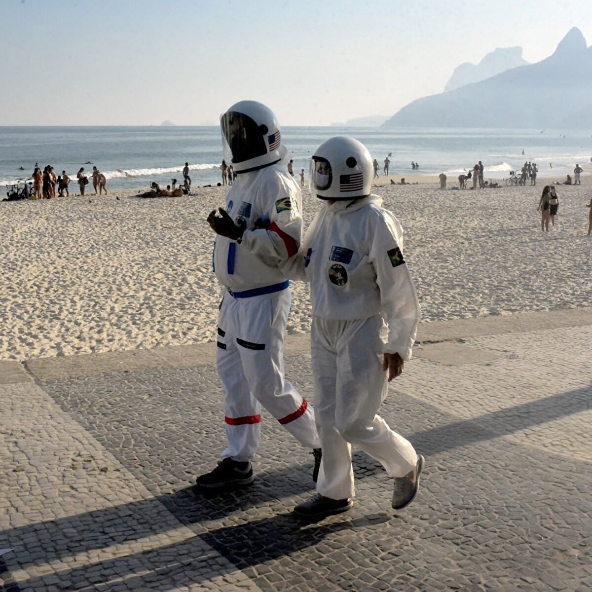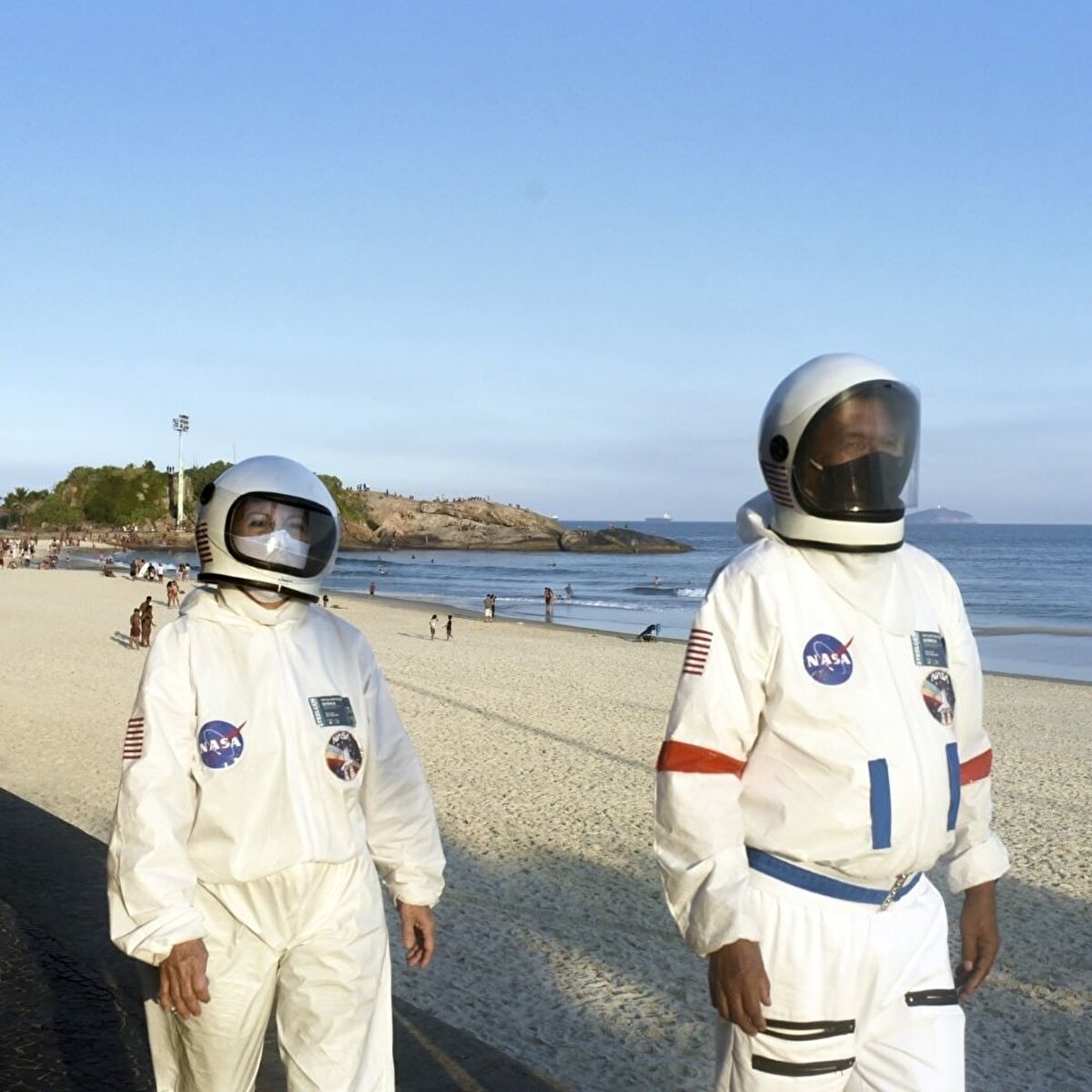 İşin aslı, Brezilyalı Tercio Galdino Lima ve eşi Alicea, Rio de Janeiro plajında Covid-19'dan dolayı güvenli bir şekilde dolaşabilmek için kendilerine uzay giysileri yapmaya karar vermiş.