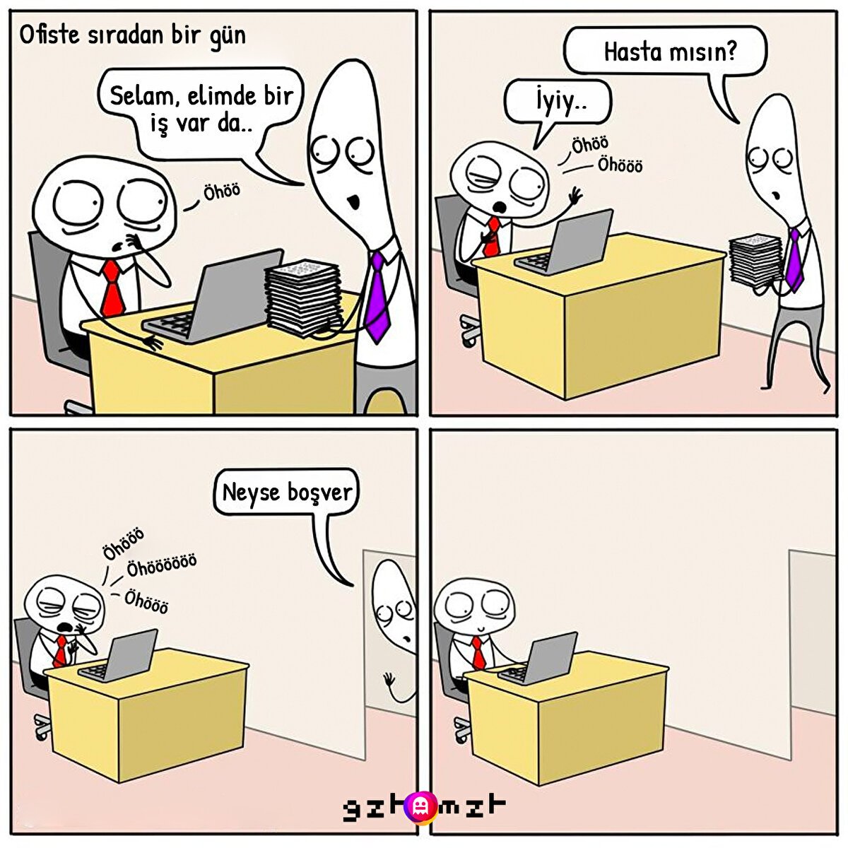Karşınıza sürekli göz altı torbalarıyla çıkan, aşırı kafein yüklemesinden bir tuhaf bakan, uykusuzluk kulaklarından damlayan biri varsa bilin ki o bir çalışandır. Kendisi de bir ofis çalışanı olan @theintrovertedattorney günlük rutinini basit ama komik çizimlerle paylaşmış.
