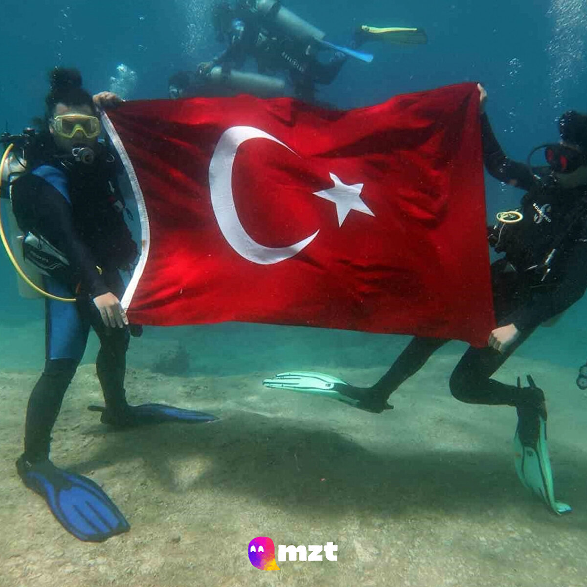 Fethiye'de bir grup dalgıç 19 Mayıs'ı, denizin dibine inerek, açtıkları Türk bayrakları ile kutlamış. Milli bayramımızı kutlamak için alışılmış yöntemlerin dışına çıkarak, oldukça farklı bir yol izleyen bu dalgıç grubunun bizlere bıraktığı fotoğraflar da göğsümüzü kabarttı.