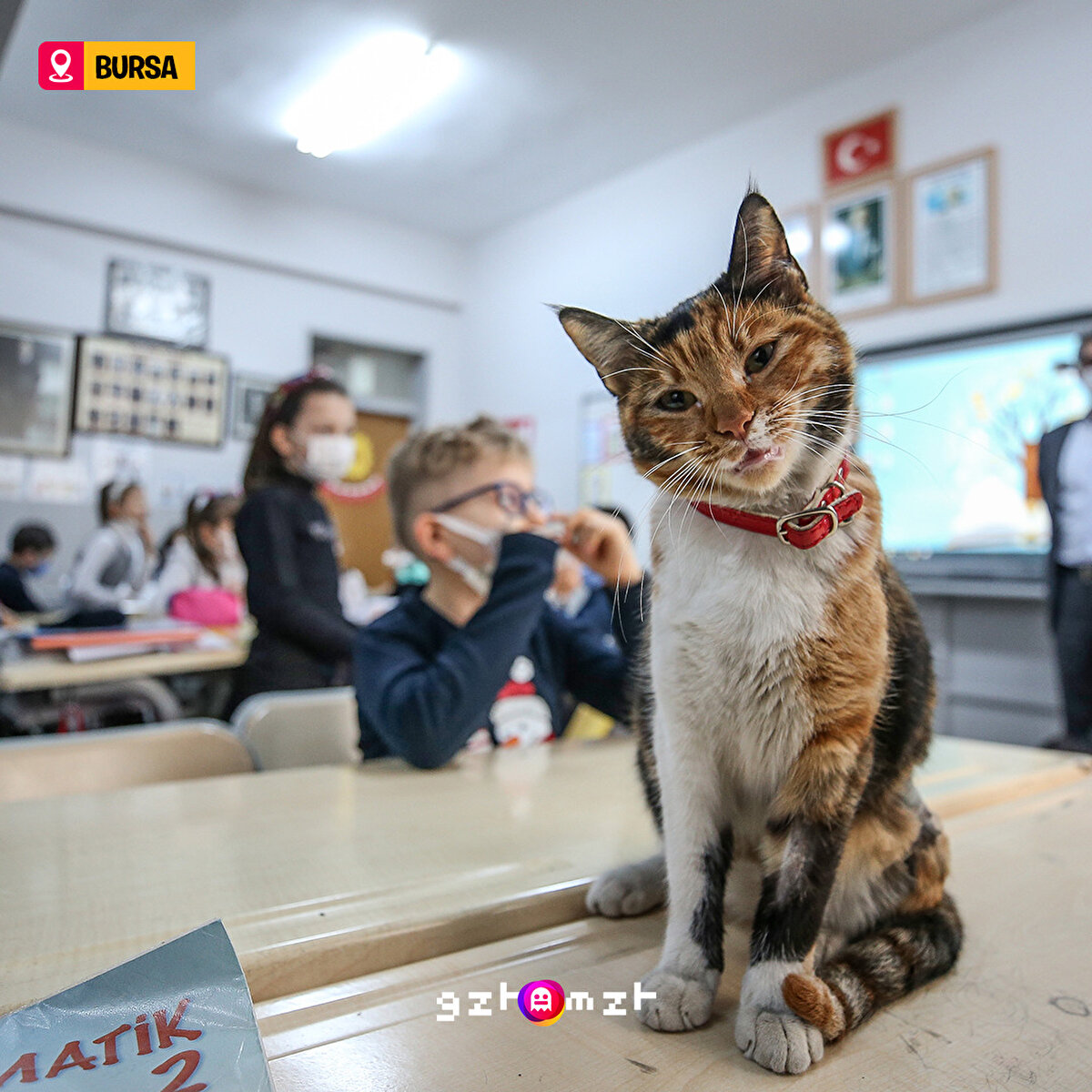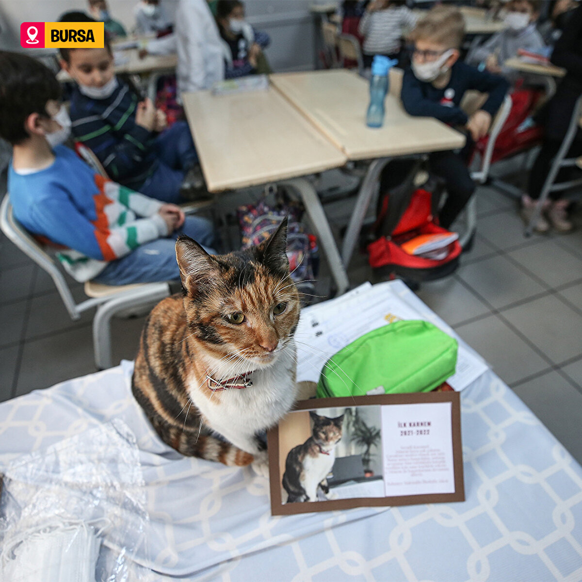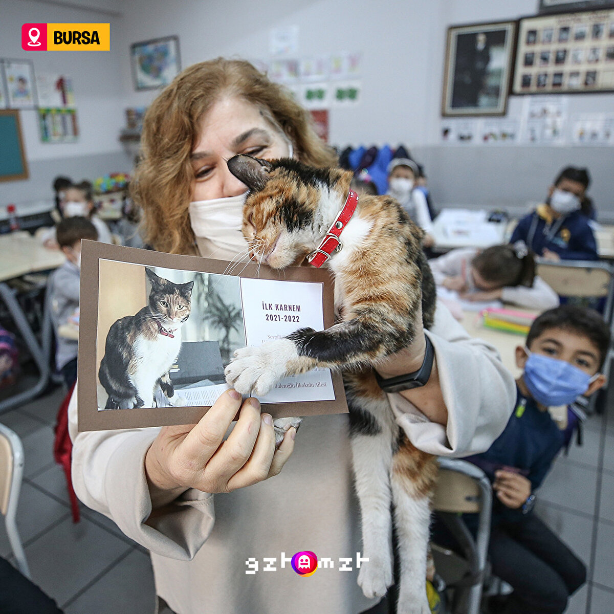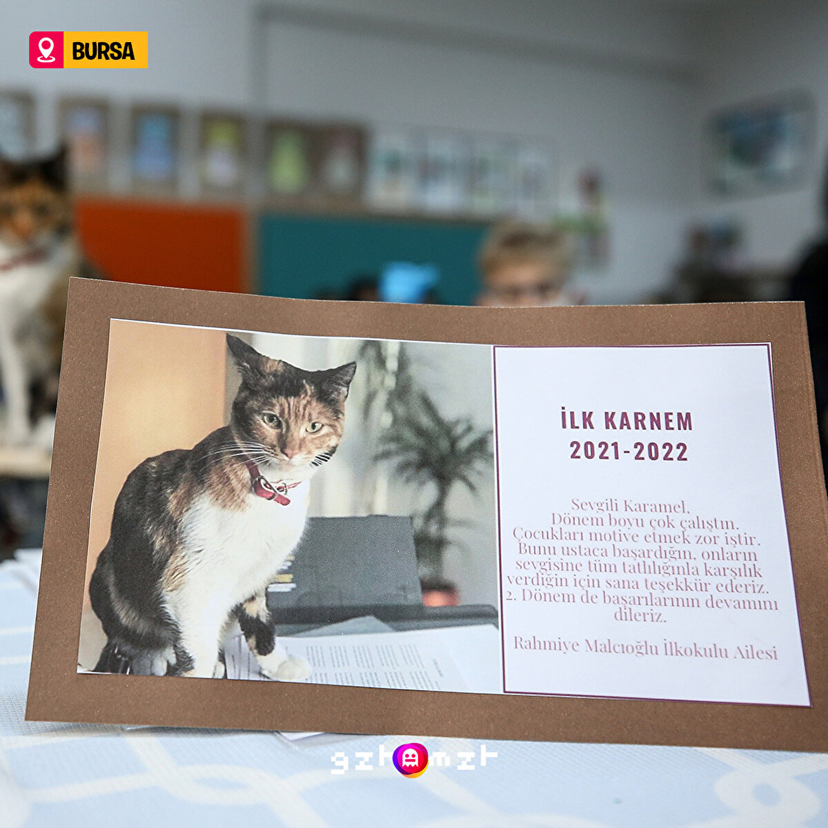 Sığındığı okulda sahiplenilen ve "Karamel" adı verilen kedi, temsili karnesini almış. Ne diyelim başarıların daim olsun hayırlı evlat ol...