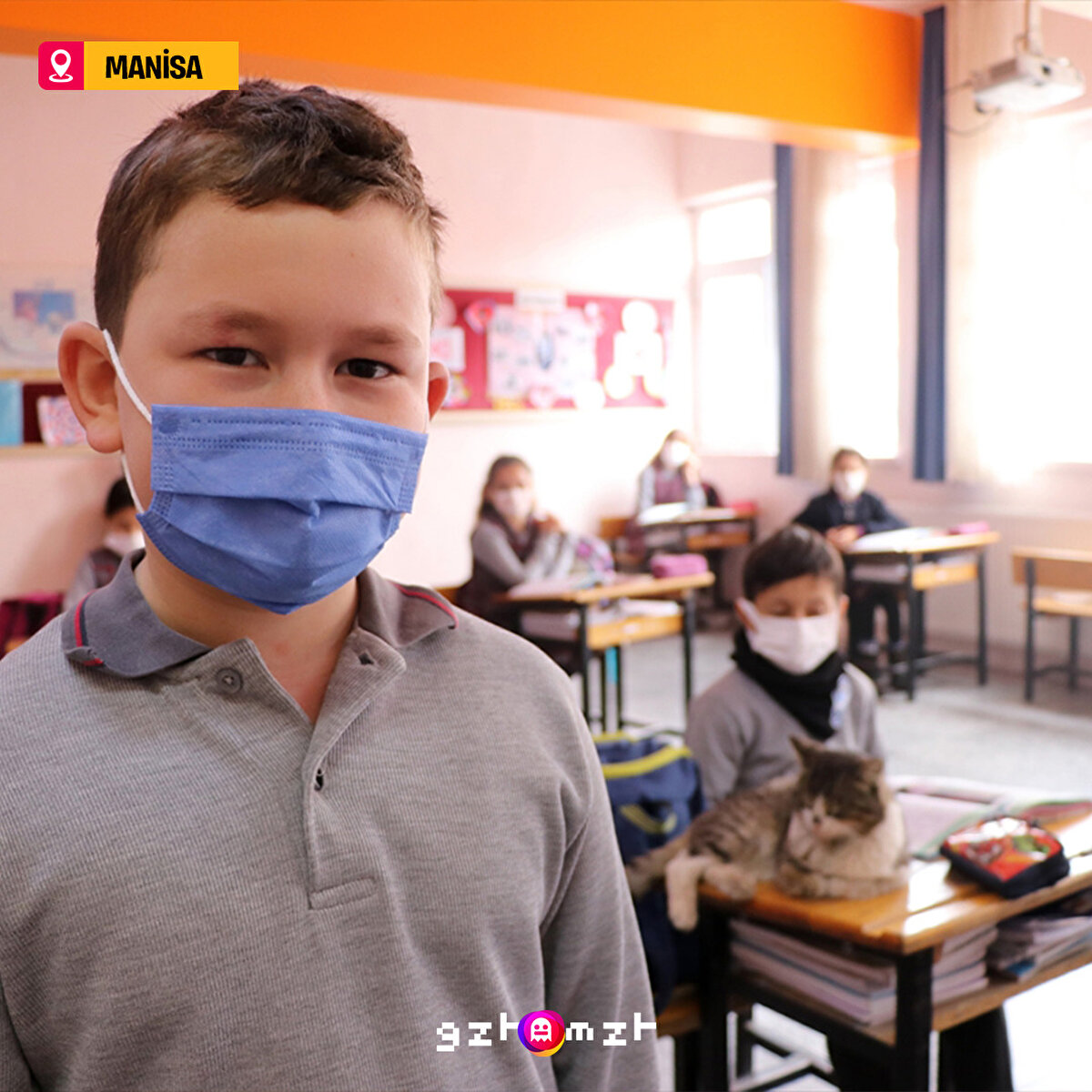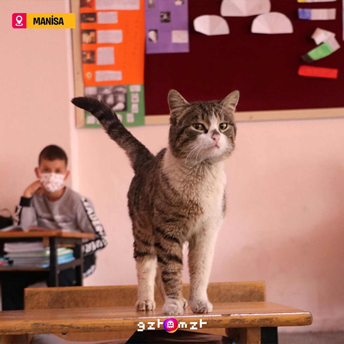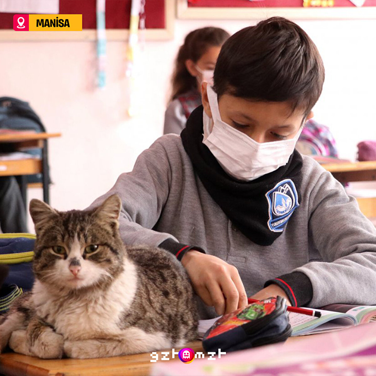 Manisa'nın Şehzadeler ilçesindeki 160 mevcutlu Karaoğlanlı İlkokulundaki öğrenciler, Uykucu adını verdikleri sokak kedisine sınıflarında bakıyor.