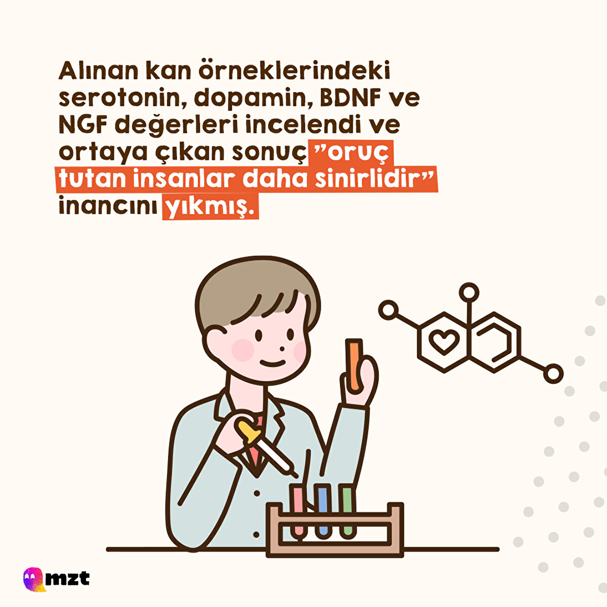 Yıllardır hepimizin bir şekilde sahip olduğu "oruç tutan insanlar diğer insanlara göre daha sinirli ve agresiftir" düşüncenizi tamamen tarihe gömecek bir bilgi ile karşınızdayız. Yapılan bir araştırmaya göre oruç tutan insanlardan alınan kan örnekleri baz alınarak, bu kan örneklerinin oruca başlamadan önce alınan kan örnekleri ile karşılaştırılması sonucu, oruç tutan insanların kanlarında bulunan NGF, BDNF, serotonin ve dopaminin arttığı gözlemlenmiş.
