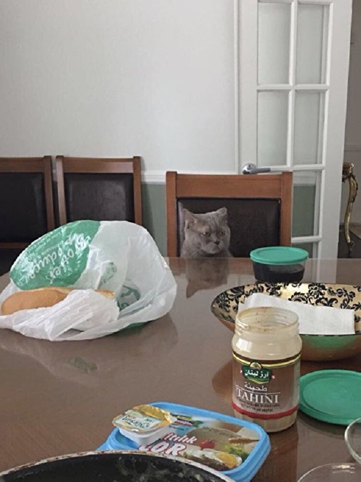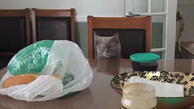 Uykulu uykulu sofraya oturan kedi bize bir şeyler anımsattı. :)