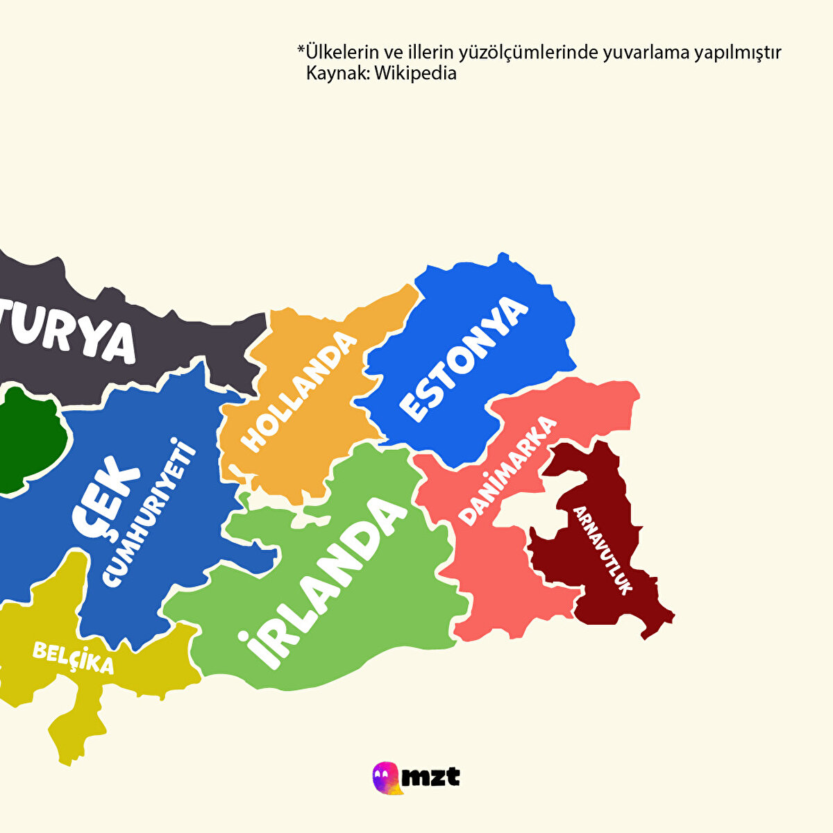 Zaman zaman Türkiye'nin coğrafi konumunu merak edip ya da herhangi bir sebep ile haritayı açıp baktığımızda Türkiye'nin gözümüze aslında içimizde hissettiğimiz büyüklükten daha küçük şekilde yansıması yanıltıcı bir durum olabilir. Yüz ölçümlerine göre hazırladığımız bu haritada Türkiye'nin içerisine kaç tane Avrupa ülkesinin sığabileceğini sizler için test ettik. Yüz ölçümleri yuvarlanarak hazırlanan bu harita ile Türkiye içerisine toplamda 14 Avrupa ülkesinin sığabileceği kanıtlanmış oldu.