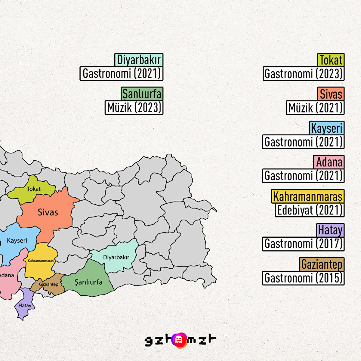 “Somut Olmayan Kültürel Miras Varlığı”, “Dünya Belleği Kütüğü”, “Dünya Mirası Geçici Listesi”… Köklü tarihi, kültürel zenginliği ve doğal güzellikleriyle Türkiye birçok alanda UNESCO'nun (Birleşmiş Milletler Eğitim, Bilim ve Kültür Kurumu) listelerinde yer alıyor. Türkiye'nin UNESCO'da yer aldığı listelerden biri ise “Creative Cities Network”. UNESCO Creative Cities Network, 2004 yılında dünyanın farklı ülkelerinden 116 şehrin katılımıyla oluşturuldu. Amacı ise çeşitli bölgelerden farklı gelir seviyeleri, kapasite ve nüfusa sahip şehirleri yaratıcı endüstriler alanında çalışmak üzere bir araya getirmek. Türkiye'de halihazırda 19 şehir UNESCO Creative Cities Network kapsamında seçildi. İşte bu şehirler ve katılmaya hak kazandıkları alanlar.